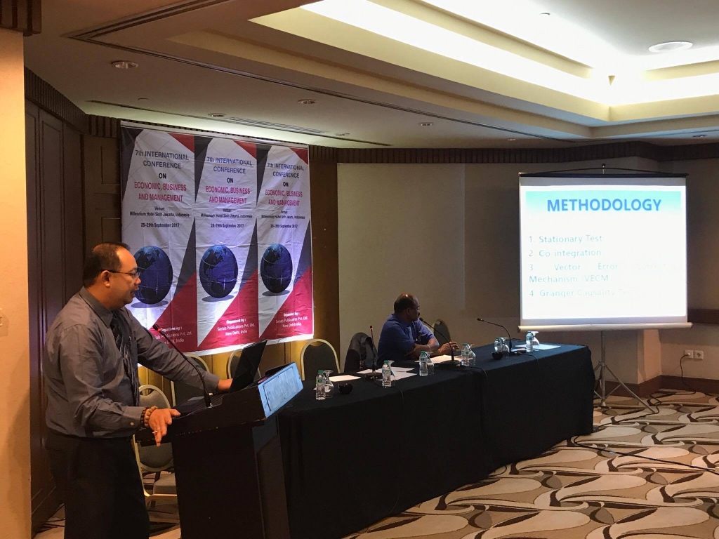 เมื่อวันที่ 27-28 กันยายน 2560 ผู้ช่วยศาสตราจารย์ ดร.ธเนศ วัฒนกูล อาจารย์สาขาเศรษฐศาสตร์ คณะสังคมศาสตร์บูรณาการ ได้เข้าร่วมและนำเสนอบทความวิจัย ในการประชุมวิชาการระดับนานาชาติ International Conference of Economic, Business and Management 2017 (ICEBM 2017) ที่ Millennium Hotel กรุง Jakarta ประเทศสาธารณรัฐอินโดนีเซีย โดยนำเสนอบทความเรื่อง Influence of Foreign Direct Investment and Export on Economic Growth of Laos ซึ่งบทความนี้ได้รับการตีพิมพ์ในวารสาร International Journal of Applied Business and Economic Research Volume 15 Number 20 ปี 2017 ที่อยู่ในฐานข้อมูล SCOPUS
