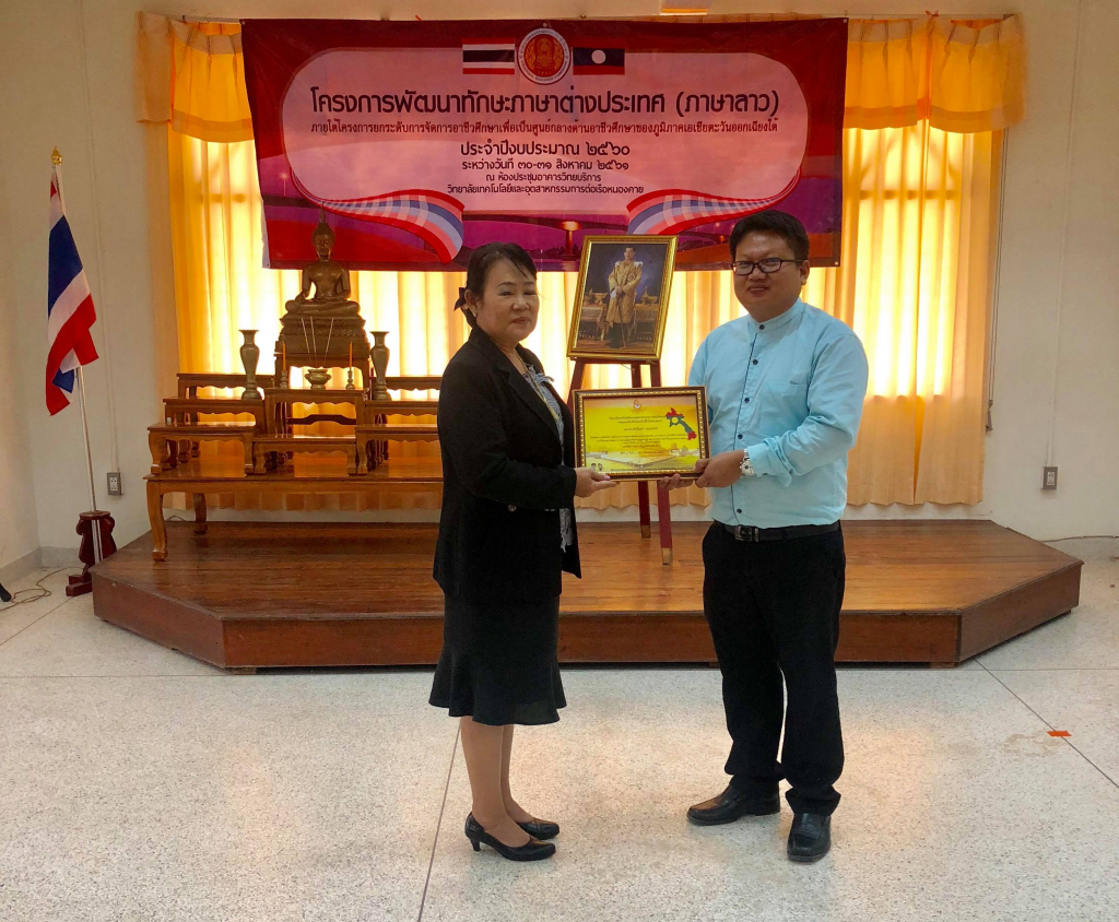 ในระหว่างวันที่ 30 -31 สิงหาคม 2561 ณ ห้องประชุมภาษาเวียดนาม อาคารวิทยาบริการ วิทยาลัยเทคโนโลยีและอุตสาหกรรมการต่อเรือ อ.เมือง จ.หนองคาย ผู้ช่วยศาสตราจารย์ ดร.ศักรินทร์ นนทพจน์ อาจารย์ประจำหลักสูตรเศรษฐศาสตรมหาบัณฑิต สาขาเศรษฐศาสตร์ธุรกิจและการจัดการ หัวหน้ากลุ่มวิจัยเศรษฐกิจการค้าระหว่างประเทศอินโดจีน คณะสังคมศาสตร์บูรณาการมหาวิทยาลัยขอนแก่น วิทยาเขตหนองคาย ได้รับเชิญให้เป็นวิทยากรบรรยาย ในโครงการพัฒนาทักษะภาษาต่างประเทศ (ภาษาลาว) ประจำปีงบประมาณ 2561 ภายใต้โครงการยกระดับการจัดการอาชีวศึกษาเพื่อเป็นศูนย์กลางด้านภูมิภาคศึกษาของภูมิภาคเอเชียตะวันออกฉียงใต้ ในการบรรยายครั้งนี้ เป็นการบรรยายถึงภาษาและวัฒนธรรมลาวเพื่อใช้ในการสื่อสาร เบื้องต้น โดยมีนักศึกษาและอาจารย์จารย์เข้าร่วมกิจกรรมประมาณ 50คน ซึ่งจากการบรรยายพบว่า ผู้เข้าร่วมโครงการสามารถใช้ภาษาลาวได้ถูกต้องมากกว่า 85%