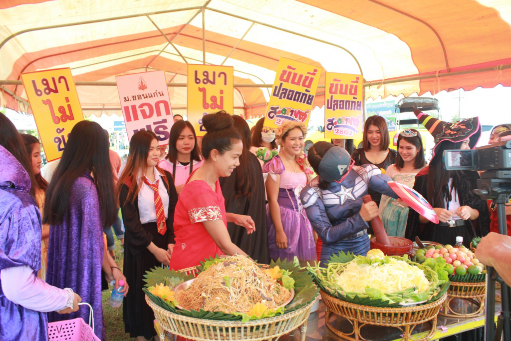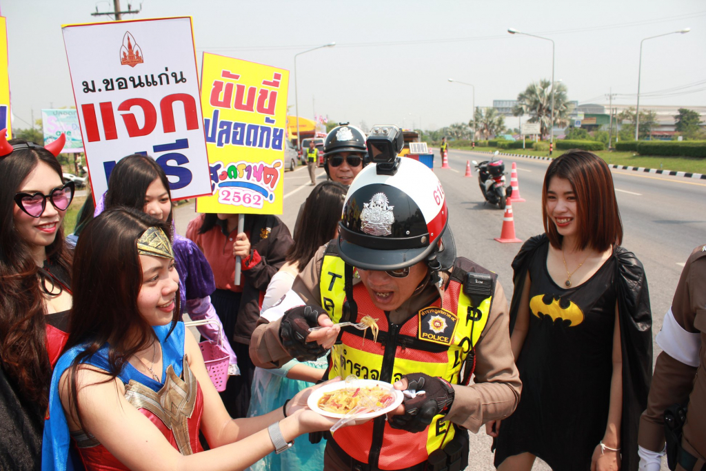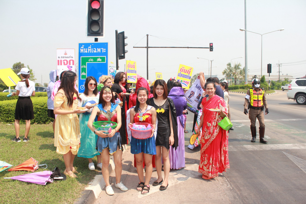 วันที่ 11 เม.ย. 62 ณ บริเวณสามแยกสะพานมิตรภาพไทย - ลาว ถนนเฉลิมพระเกียร์ติ จ. หนองคาย ผศ.ดร.กริซ แรงสูงเนิน คณบดีคณะบริหารธุรกิจ นำนักศึกษา สาขาธุรกิจระหว่างประเทศ คณะบริหารธุรกิจ มหาวิทยาลัยขอนแก่น วิทยาเขตหนองคาย แต่งกายด้วยชุดคอสเพลย์ สร้างสีสัน ร่วมรณค์ขับขี่ปลอดภัยในวันสงกรานต์ ซึ่งได้รับการตอบรับที่ดีจากผู้ใช้รถใช้ถนนทุกคน ต่างให้ความสนใจอย่างมาก