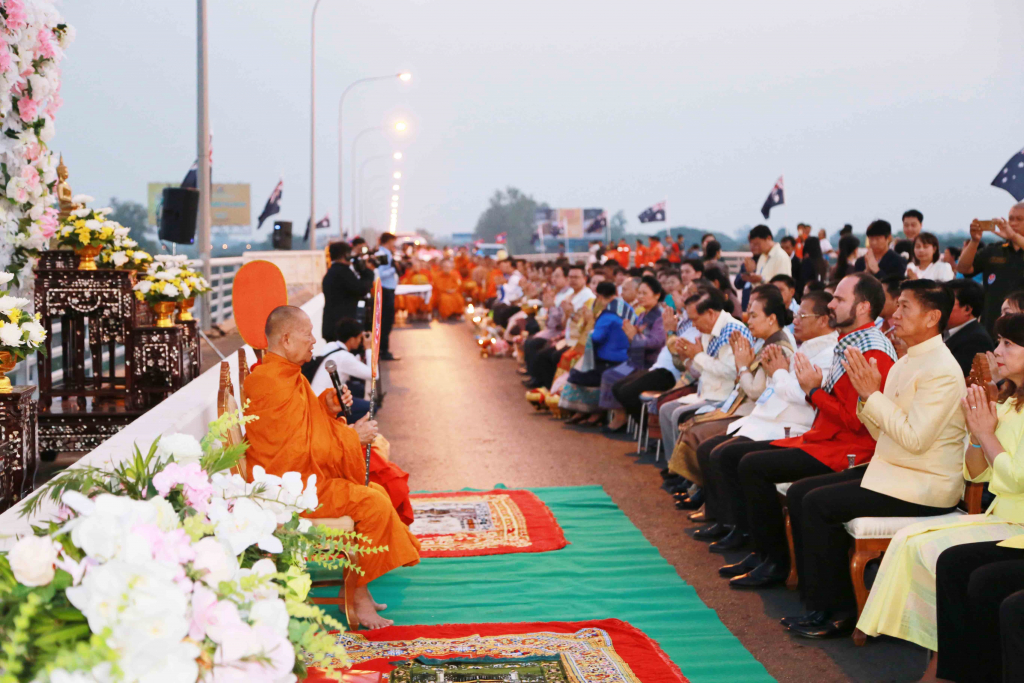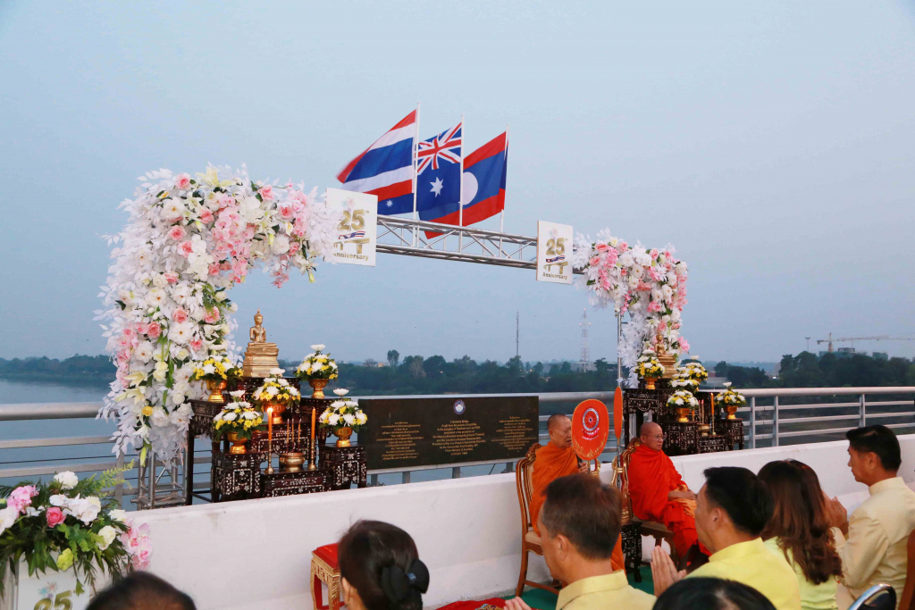 วันที่ 26 เมษายน 2562 เวลา 05.00 น. บริเวณบนสะพานมิตรภาพไทย-ลาว แห่งที่ 1 อำเภอเมือง จังหวัดหนองคาย นายละมุณ กั้งจำปา ผู้อำนวยการสำนักงานวิทยาเขตหนองคาย นำบุคลากรสำนักงานวิทยาเขตหนองคาย ร่วมพิธีทำบุญตักบาตรสองแผ่นดิน โดยมีพระสงฆ์ไทยและลาว จำนวน 125 รูป ออกเดินรับบิณฑบาตรบนสะพานมิตรภาพฯ มีประชาชนชาวไทยและชาวลาวเข้าร่วมทำบุญตักบาตรเป็นจำนวนมาก โดยมีนายรณชัย จิตรวิเศษ ผู้ว่าราชการจังหวัดหนองคาย พร้อมด้วยนายสีหุน สิทธิลือไซ รักษาการเจ้าครองนครหลวงเวียงจันทน์ และ ฯพณฯ จีน-เบอนาร์ด คารัสโก เอกอัครราชทูต ออสเตรเลีย ประจำ สปป.ลาว ร่วมเป็นประธานร่วมเปิดงานฉลองย้อนรอยสะพานมิตรภาพไทย-ลาว แห่งที่ 1 และนิทรรศการฉลองวันครบรอบ 25 ปี สะพานมิตรภาพไทย-ลาว แห่งที่ 1 พร้อมร่วมประดับธงออสเตรเลีย เพื่อเป็นการให้เกียรติในฐานะที่เป็นผู้สนับสนุนงบประมาณในการสร้างสะพานมิตรภาพไทย-ลาว แห่งที่ 1 จำนวน 750 ล้านบาท (42 ล้านดอลลาร์ออสเตรเลีย) ซึ่งการจัดงานครั้งนี้ เพื่อฉลองวันครบรอบ 25 ปี สะพานมิตรภาพไทย-ลาว แห่งที่ 1 นับตั้งแต่วันเปิดใช้งานครั้งแรก และเพื่อเชื่อมความสัมพันธ์อันดีกับประเทศเพื่อนบ้าน