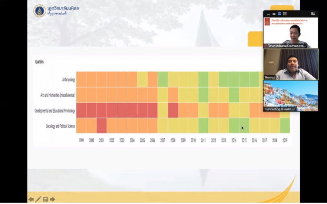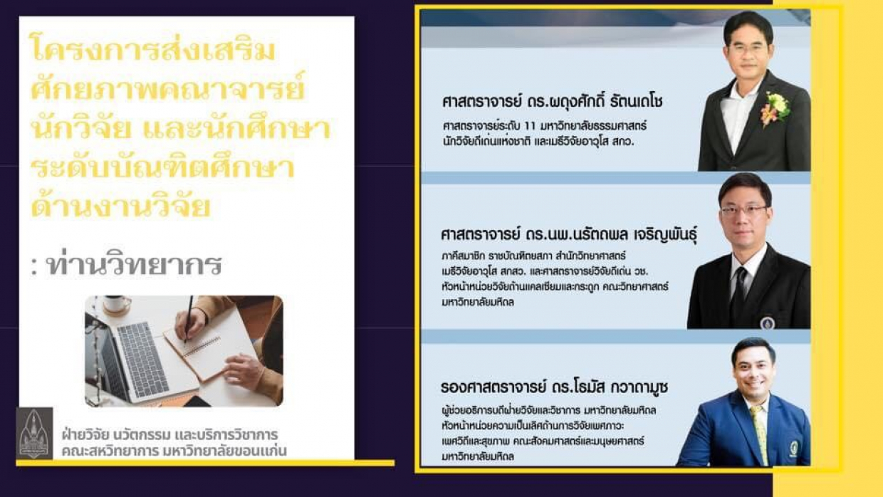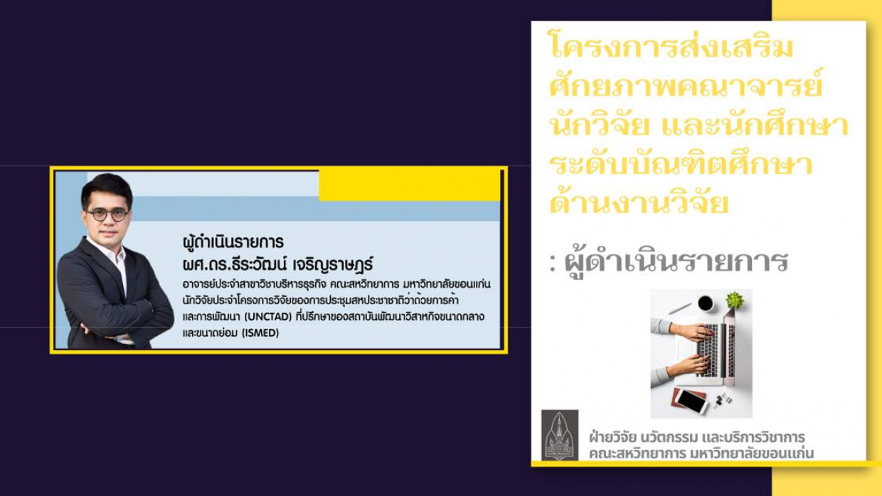 Section 2 : ด้านมนุษยศาสตร์ สังคมศาสตร์ และบริหารธุรกิจ” โดยท่านวิทยากร รองศาสตราจารย์ ดร.โธมัส กวาดามูซ ผู้ช่วยอธิการบดีฝ่ายวิจัยและวิชาการ มหาวิทยาลัยมหิดล หัวหน้าหน่วยความเป็นเลิศด้านการวิจัยเพศภาวะ เพศวิถีและสุขภาพ คณะสังคมศาสตร์และมนุษยศาสตร์ มหาวิทยาลัยมหิดล และผู้ดำเนินรายการ โดยผู้ช่วยศาสตราจารย์ ดร.ธีระวัฒน์ เจริญราษฎร์ อาจารย์ประจำสาขาวิชาบริหารธุรกิจ คณะสหวิทยาการ มหาวิทยาลัยขอนแก่น นักวิจัยประจำโครงการวิจัยของการประชุมสหประชาชาติว่าด้วยการค้าและการพัฒนา (UNCTAD) ที่ปรึกษาของสถาบันพัฒนาวิสาหกิจขนาดกลางและขนาดย่อม (ISMED) มีผู้เข้าร่วมโครงการเป็นจำนวนมากทั้งบุคลากรภายในและภายนอกคณะสหวิทยาการ มหาวิทยาลัยขอนแก่น วิทยาเขตหนองคาย จำนวน 129 คน โดยวัตถุประสงค์โครงการเพื่อส่งเสริมและสนับสนุนให้คณาจารย์ นักวิจัย และนักศึกษาระดับบัณฑิตศึกษามีผลงานตีพิมพ์ในฐานข้อมูล นานาชาติ Scopus และ/หรือ ISI Web of Science เพิ่มขึ้น โดยสนับสนุนให้ตีพิมพ์บทความในระดับนานาชาติที่อยู่ในควอไทล์ที่ 1, 2 ของการจัดลำดับโดย SJR (SCImago Journal Rank) ซึ่งเป็นดัชนีชี้วัดคุณภาพและความสำเร็จของการวิจัย รวมถึงเป็นการชี้วัดคุณภาพของมหาวิทยาลัยขอนแก่นอีกด้วย
