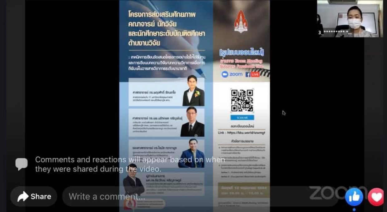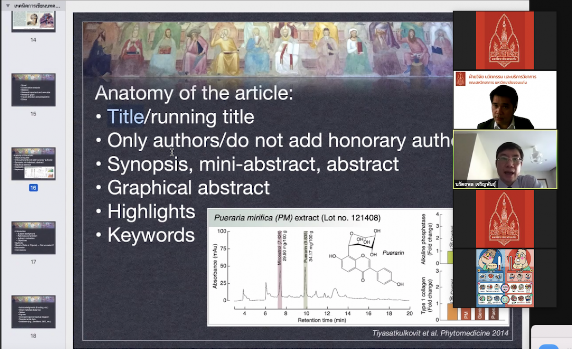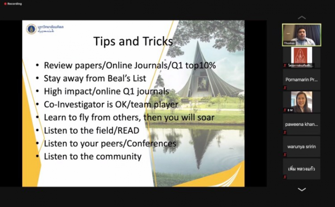 วันที่ 12 เดือน พฤษภาคม 2564 งานวิจัย นวัตกรรมและบริการวิชาการ คณะสหวิทยาการ มหาวิทยาลัยขอนแก่น วิทยาเขตหนองคาย ผู้ช่วยศาสตราจารย์ ดร.วัลลภา วงศ์ศีลธรรม กรรมการฝ่ายวิจัย นวัตกรรมและบริการวิชาการ อาจารย์ประจำสาขาวิชาเทคโนโลยีและวิศวกรรมศาสตร์ คณะสหวิทยาการ มหาวิทยาลัยขอนแก่น วิทยาเขตหนองคาย ได้จัดโครงการส่งเสริมศักยภาพคณาจารย์ นักวิจัย และนักศึกษาระดับบัณฑิตศึกษาด้านงานวิจัย : เทคนิคการเขียนข้อเสนอโครงการอย่างไรให้ได้รับทุน และการเขียนบทความวิจัย/บทความวิชาการเพื่อการตีพิมพ์ในวารสารวิชาการระดับนานาชาติ ประจำปีงบประมาณ 2564 ในรูปแบบออนไลน์ผ่านระบบ ZOOM Meeting และการรับชมผ่านทาง Facebook Live ของคณะสหวิทยาการ ได้รับเกียรติจาก ผู้ช่วยศาสตราจารย์ ดร.สุนทรี บูชิตชน รองคณบดีคณะสหวิทยาการ เป็นประธานในพิธีเปิดงาน โดยภาคเช้าเป็นการบรรยายในหัวข้อ “ทิศทางการสร้างงานวิจัยแบบบูรณาการให้ตอบโจทย์ประเทศ การสร้างเครือข่ายวิจัยระดับนานาชาติ การทำงานวิจัยร่วมกับภาคเอกชนอย่างมืออาชีพ” และ หัวข้อ “เทคนิคการเขียนข้อเสนอโครงการอย่างไรให้ได้รับทุน : วิจัยเพื่อสร้างองค์ความรู้ และนำผลงานไปใช้ประโยชน์” โดยท่านวิทยากร ศาสตราจารย์ ดร.ผดุงศักดิ์ รัตนเดโช ศาสตราจารย์ระดับ 11 มหาวิทยาลัยธรรมศาสตร์ นักวิจัยดีเด่นแห่งชาติ และเมธีวิจัยอาวุโส สกว. และภาคบ่ายเป็นการบรรยายในหัวข้อ “เทคนิคการเขียนบทความวิจัย/บทความวิชาการเพื่อการตีพิมพ์ในวารสารวิชาการระดับนานาชาติ ฐานข้อมูล Scopus/ISI Q1, Q2