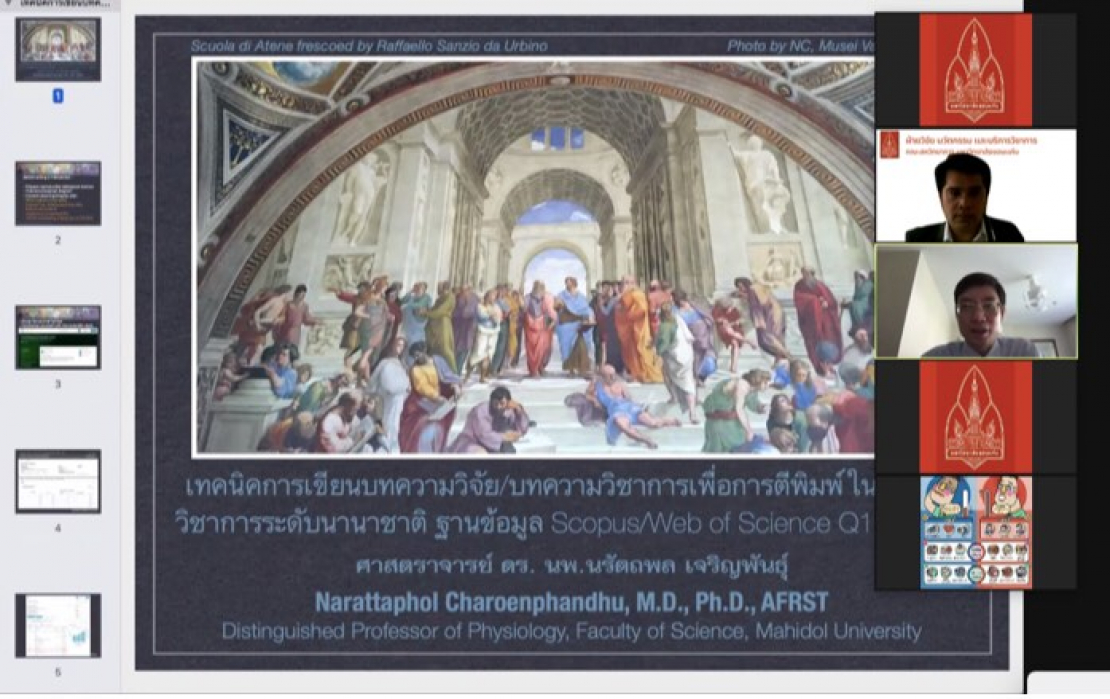 Section 1: ด้านวิทยาศาสตร์ เทคโนโลยีและนวัตกรรม” โดยท่านวิทยากร ศาสตราจารย์ ดร. นพ.นรัตถพล เจริญพันธุ์ ภาคีสมาชิก ราชบัณฑิตยสภา สำนักวิทยาศาสตร์ เมธีวิจัยอาวุโส สกสว. และศาสตราจารย์วิจัยดีเด่น วช. หัวหน้าหน่วยวิจัยด้านแคลเซียมและกระดูก คณะวิทยาศาสตร์ มหาวิทยาลัยมหิดล และการบรรยายในหัวข้อ “เทคนิคการเขียนบทความวิจัย/บทความวิชาการเพื่อการตีพิมพ์ในวารสารวิชาการระดับนานาชาติ ฐานข้อมูล Scopus/ISI Q1, Q2