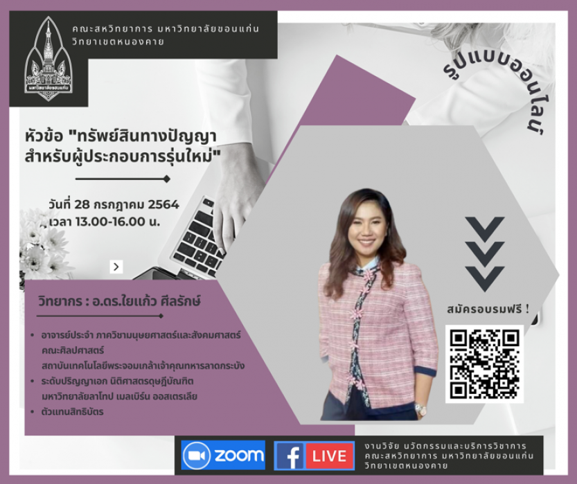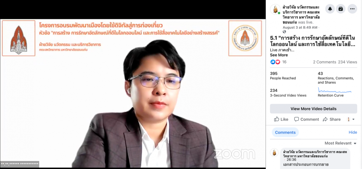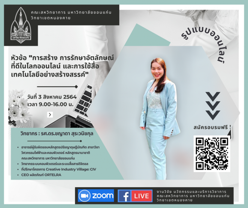 5.การสร้าง การรักษาอัตลักษณ์ที่ดีในโลกออนไลน์ และการใช้สื่อเทคโนโลยีอย่างสร้างสรรค์ จัดขึ้นในวันที่ 3 สิงหาคม 2564 วิทยากรโดย รองศาสตราจารย์ ดร.ชญาดา สุระวนิชกุล และดำเนินการเสวนาโดย ผู้ช่วยศาสตราจารย์ ดร.วัลลภา วงศ์ศีลธรรม อาจารย์ประจำหลักสูตรปรัชญาดุษฎีบัณฑิต สาขาวิชาวิศวกรรมไฟฟ้าและคอมพิวเตอร์ หลักสูตรนานาชาติ คณะสหวิทยาการ มหาวิทยาลัยขอนแก่น วิทยาเขตหนองคาย หัวข้อนี้ มุ่งเน้นเพื่อส่งเสริมให้ผู้ประกอบการธุรกิจมีความสามารถในการใช้สื่อดิจิทัลเพื่อสร้างอัตลักษณ์ที่ดีของธุรกิจในโลกออนไลน์ และส่งเสริมการออกแบบแนวคิดการสร้างแบรนด์ของตนเองให้เป็นที่จดจำในโลกออนไลน์ รวมถึงแนวทางการสร้างคอนเทนต์ของแบรนด์เพื่อสื่อสารและส่งเสริมธุรกิจของผู้ประกอบการได้อย่างมีประสิทธิภาพและเกิดประโยชน์สูงสุด