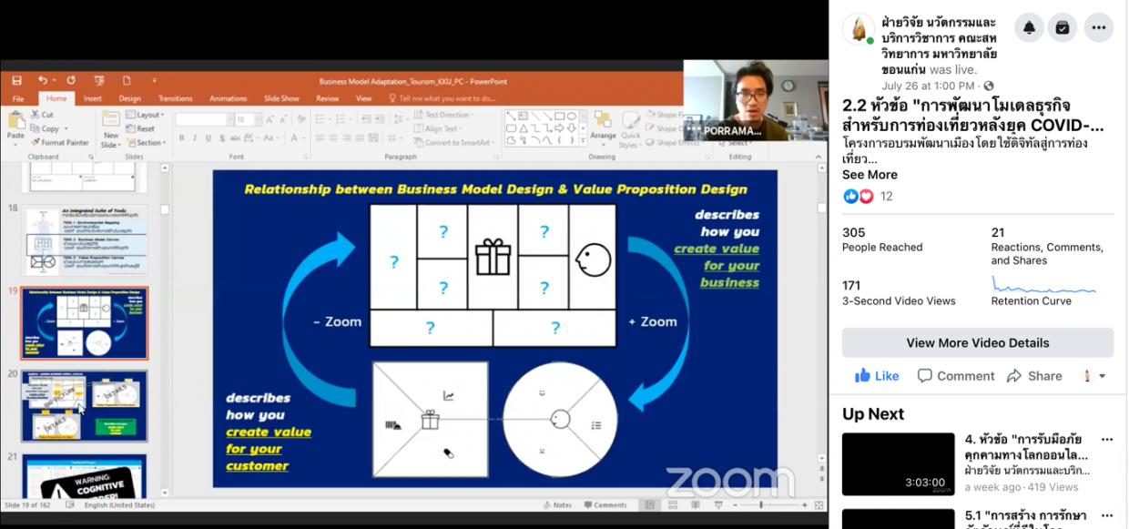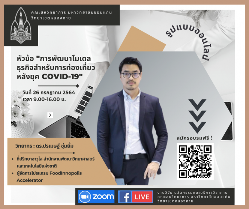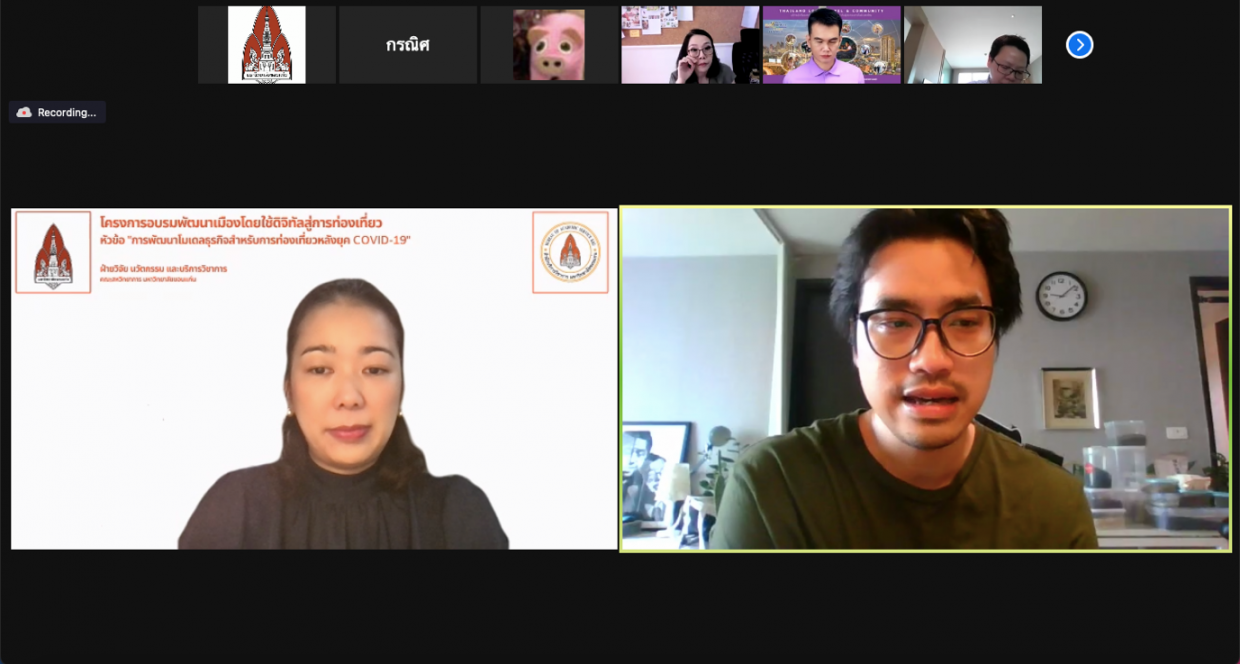 2.การพัฒนาโมเดลธุรกิจสำหรับการท่องเที่ยวหลังยุค COVID-19 จัดขึ้นในวันที่ 26 กรกฎาคม 2564 วิทยากรโดย ดร.ปรเมษฐ์ ชุ่มยิ้ม เป็นการอบรมเชิงปฏิบัติการพัฒนาโมเดลธุรกิจสำหรับการท่องเที่ยวหลังยุค COVID-19 เพื่อให้ผู้ประกอบการได้ออกแบบธุรกิจที่ตนเองสนใจผ่านเครื่องมือ Design Thinking ให้สามารถตอบโจทย์ผู้บริโภคได้อย่างแท้จริง โดยมีผู้ประกอบการจากหลากหลายแห่งร่วมแชร์ไอเดียและประสบการณ์ในการดำเนินธุรกิจและการวางแผนธุรกิจเพื่อให้เกิดการต่อยอดสู่การดำเนินงานในชุมชนต่าง ๆ ได้อย่างมีประสิทธิภาพ