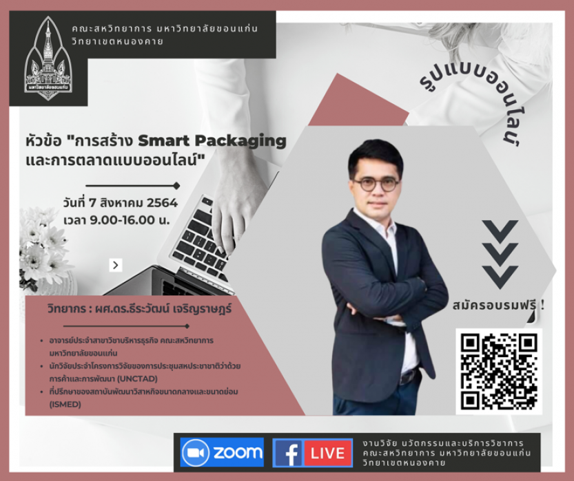 6.การสร้าง Smart Packaging และการตลาดแบบออนไลน์ จัดขึ้นในวันที่ 7 สิงหาคม 2564 วิทยากรโดย ผู้ช่วยศาสตราจารย์ ดร.ธีระวัฒน์ เจริญราษฎร์ อาจารย์ประจำสาขาวิชาบริหารธุรกิจ คณะสหวิทยาการ มหาวิทยาลัยขอนแก่น วิทยาเขตหนองคาย ในหัวข้อนี้เป็นการอบรมเพื่อสร้างไอเดียในการเตรียมผลิตภัณฑ์ให้มีความน่าสนใจและเตรียมความพร้อมในการขายสินค้าในรูปแบบออนไลน์ที่ตอบโจทย์ลูกค้ากลุ่มต่าง ๆ รวมถึงลูกค้ากลุ่มนักท่องเที่ยว ซึ่งในการพัฒนาการขายสินค้าออนไลน์นั้นสามารถเชื่อมโยงถึงอัตลักษณ์ของสินค้ากับวัฒนธรรมท้องถิ่นเพื่อสร้างมูลค่าเพิ่มให้กับสินค้าได้โดยเฉพาะในช่วงสถานการณ์การแพร่ระบาดของ COVID-19 นี้