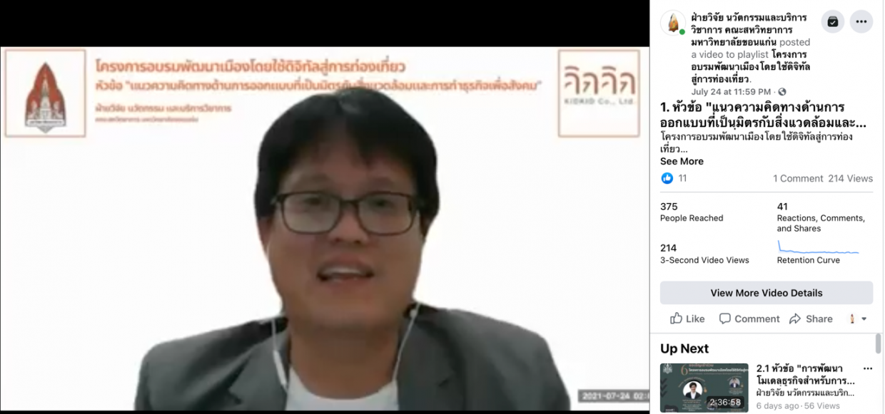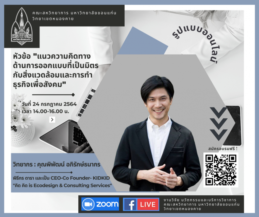 1.แนวความคิดทางด้านการออกแบบที่เป็นมิตรกับสิ่งแวดล้อมและการทำธุรกิจเพื่อสังคม จัดขึ้นในวันที่ 24 กรกฎาคม 2564 วิทยากรโดย คุณท็อป พิพัฒน์ อภิรักษ์ธนากร พิธีกร และนักออกแบบเพื่อความยั่งยืน บริษัท คิดคิด จำกัด และร่วมดำเนินรายการเสวนาโดย อาจารย์อายุวัฒ ธนาเศรษฐอังกูล อาจารย์ประจำหลักสูตรวิทยาศาสตรบัณฑิต สาขาวิชาวิทยาศาสตร์สิ่งแวดล้อมและทรัพยากรธรรมชาติ คณะสหวิทยาการ มหาวิทยาลัยขอนแก่นวิทยาเขตหนองคาย ในหัวข้อนี้ได้กล่าวถึงแนวคิดเริ่มต้นในการสร้างธุรกิจ แรงบันดาลใจ รวมถึงแนวคิดที่อยู่เบื้องหลังการออกแบบธุรกิจซึ่งได้ออกแบบมาเพื่อตอบโจทย์ทางสิ่งแวดล้อมและการพัฒนาชุมชนเพื่อส่งเสริมการท่องเที่ยวรูปแบบใหม่ๆ ให้เกิดขึ้นในชุมชนได้