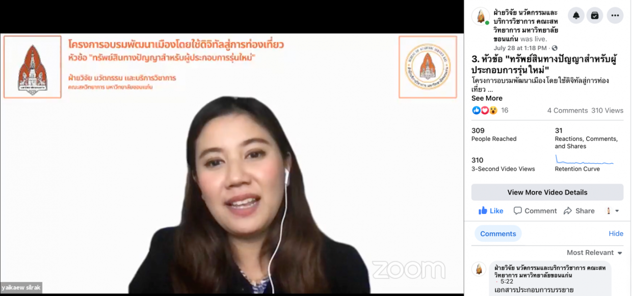 3.ทรัพย์สินทางปัญญาสำหรับผู้ประกอบการรุ่นใหม่ จัดขึ้นในวันที่ 28 กรกฎาคม 2564 วิทยากรโดยอาจารย์ ดร.ใยแก้ว ศีลรักษ์ อาจารย์ประจำภาควิชามนุษยศาสตร์และสังคมศษสตร์ คณะศิลปะศาสตร์ สถาบันเทคโนโลยีพระจอมเกล้าเจ้าคุณทหารลาดกระบัง หัวข้อนี้เป็นการอบรมเชิงปฏิบัติการเพื่อเปิดแนวความคิดโลกธุรกิจที่เกี่ยวข้องกับการท่องเที่ยว ถึงความเชื่อมโยงของทรัพย์สินทางปัญญาที่สามารถสร้างมูลค่าเพิ่มแก่ผู้ประกอบการธุรกิจได้ ทั้งในส่วนของเครื่องหมายทางการค้า ลิขสิทธิ์ สิทธิบัตร หรือความลับทางการค้า