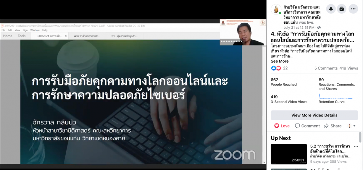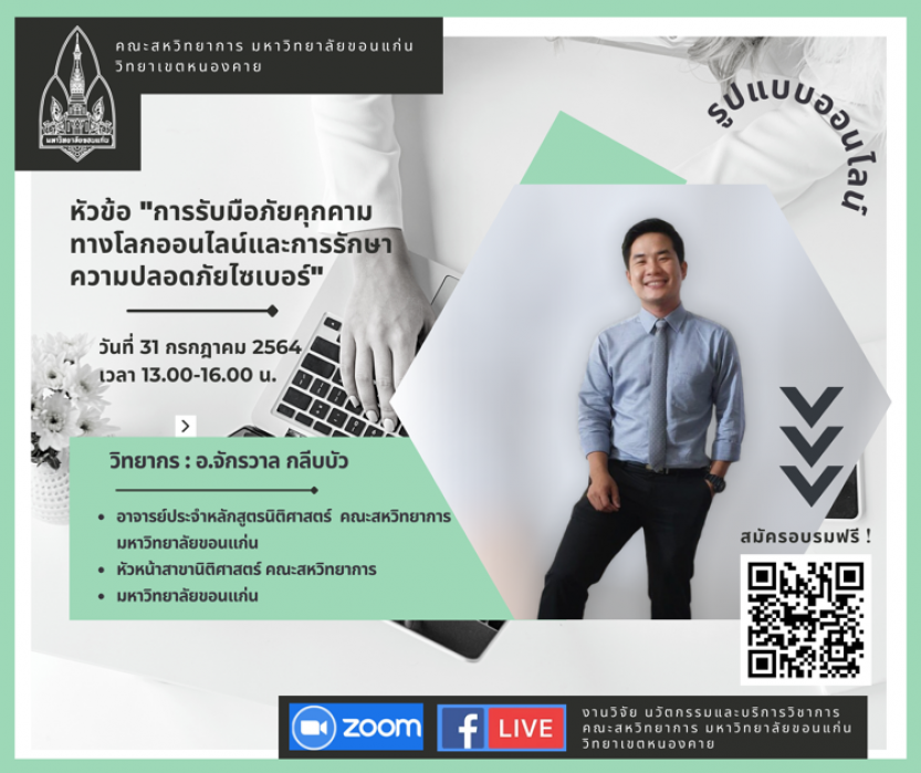 4.การรับมือภัยคุกคามทางโลกออนไลน์และการรักษาความปลอดภัยไซเบอร์ จัดขึ้นในวันที่ 31 กรกฎาคม 2564 วิทยากรโดยอาจารย์จักรวาล กลีบบัว หัวหน้าสาขาวิชานิติศาสตร์ คณะสหวิทยาการ มหาวิทยาลัยขอนแก่น วิทยาเขตหนองคาย และดำเนินการเสวนาโดย อ.ภีชญา จงอุดมการณ์ อาจารย์ประจำสาขาวิชานิติศาสตร์ คณะสหวิทยาการ มหาวิทยาลัยขอนแก่น วิทยาเขตหนองคาย หัวข้อนี้เป็นการอบรมและการเสวนาเพื่อส่งเสริมทักษะการใช้ดิจิทัลเทคโนโลยีอย่างมีจริยธรรม มุ่งเน้นให้เกิดความตระหนักถึงผลพวงทางสังคม การเมือง เศรษฐกิจ และวัฒนธรรม ที่เกิดจากการใช้อินเทอร์เน็ต การกดไลค์ กดแชร์ ข้อมูล ข่าวสาร ออนไลน์ รวมถึงรู้จักสิทธิและความรับผิดชอบออนไลน์ อาทิ เสรีภาพในการพูด การเคารพทรัพย์สินทางปัญญาของผู้อื่น และการปกป้องตนเองและชุมชนจากความเสี่ยงออนไลน์ เช่น การกลั่นแกล้งออนไลน์ ภาพลามกอนาจารเด็ก สแปม เป็นต้น