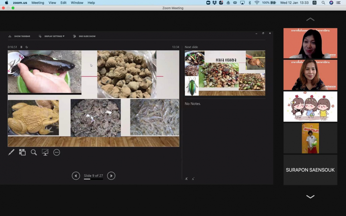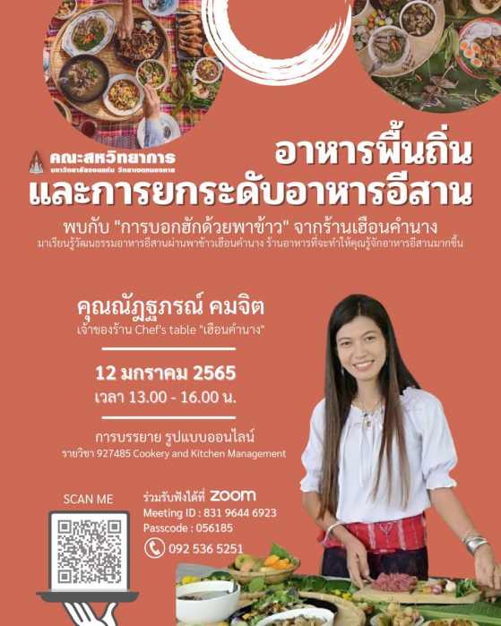 วันพุธที่ 12 มกราคม 2565 เวลา 13.00-16.00 น. หลักสูตรนวัตกรรมการท่องเที่ยวและการบริการ คณะสหวิทยาการ มหาวิทยาลัยขอนแก่น จัดอบรมเชิญวิทยากรผู้เชี่ยวชาญด้านศาสตร์แห่งอาหารมาให้ความรู้แก่นักศึกษาและบุคคลทั่วไปในรูปแบบออนไลน์ วันพุธที่ 12 มกราคม 2565 และวันพุธที่ 19 มกราคม 2565 หัวข้อ “อาหารพื้นถิ่นและการยกระดับอาหารอีสาน” เป็นการถ่ายทอด “การบอกฮักด้วยพาข้าว” วิทยากร คุณคำนาง จากเฮือนคำนาง จังหวัดขอนแก่น มีผู้เข้าร่วมคือนักศึกษาในหลักสูตรจากชั้นปีต่างๆ คณาจารย์และบุคคลภายนอกที่สนใจ จำนวนประมาณ 50 คนเข้าร่วมเรียนรู้วัฒนธรรมอีสานผ่านประสบการณ์การปรุงอาหารของเฮือนคำนาง โดยการรับฟังการบรรยายและแลกเปลี่ยนเรียนรู้ในครั้งนี้ทำให้ผู้เข้าร่วมได้รับชุดความรู้ทางภูมิปัญญาอาหารอีสานที่เป็นต้นทุนที่ดีการสร้างคุณค่าเพิ่มมูลค่าอาหารอีสานที่วิทยากรนำมาถ่ายทอดและยกตัวอย่างให้ฟังจากประสบการณ์จริงนอกจากนั้นในการบรรยายยังเปิดโอกาสให้มีการซักถามและแลกเปลี่ยนมุมมองศาสตร์แห่งอาหารร่วมกันอีกด้วย