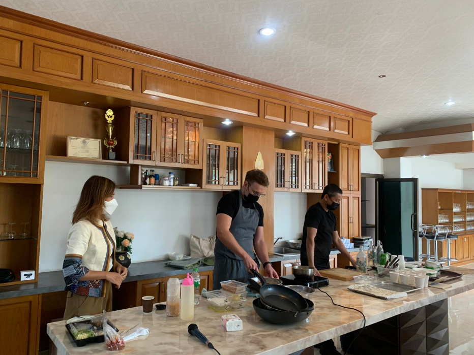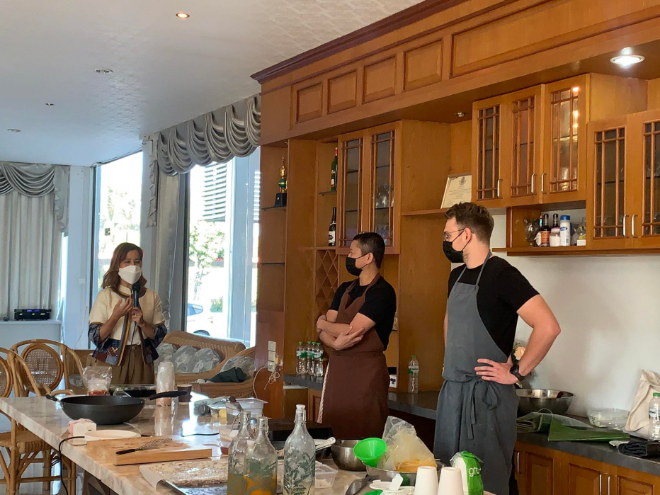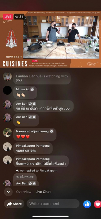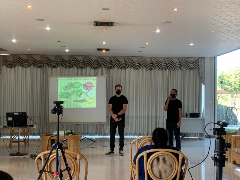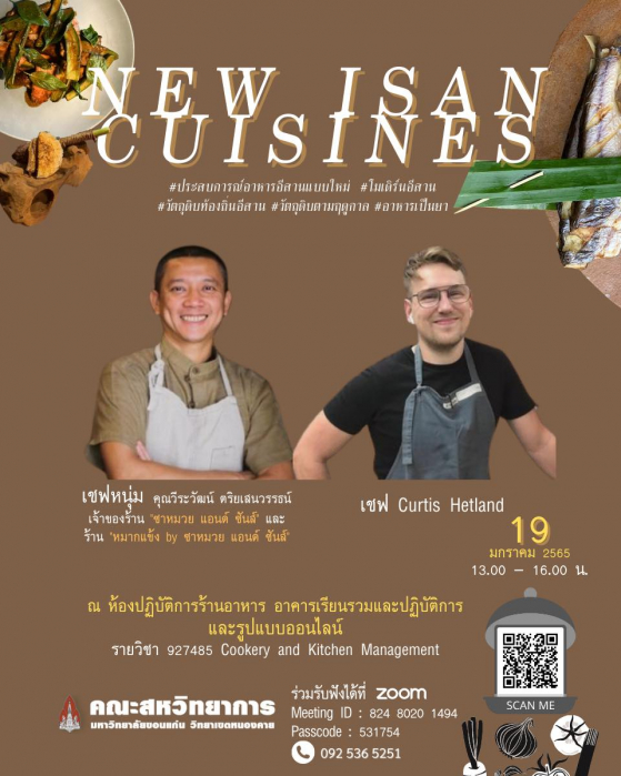 และการบรรยายอีกหนึ่งหัวข้อจัดขึ้นในวันพุธที่ 19 มกราคมเวลา 13.00-16.00 น. หัวข้อ “ New Isan Cuisines” โดย เชฟหนุ่มและเชฟ Curtis จากร้านซาหมวยแอนด์ซัน จังหวัดอุดรธานี ร้านที่มี hashtag เหล่านี้เป็นเอกลักษณ์ # ประสบการณ์อาหารอีสานรูปแบบใหม่#วัตถุดิบท้องถิ่นอีสาน#วัตถุดิบตามฤดูกาล#โมเดิร์นอีสาน#อาหารเป็นยาการบรรยายในครั้งนี้วิทยากรได้ถ่ายทอดประสบการณ์การทำร้านอาหารซาหมวยแอนด์ซัน ร้านอาหารที่ให้ความสำคัญกับวัตถุดิบท้องถิ่น การเล่าเรื่องราวการทำโปรเจ็คการทำงานร่วมกันของเชฟหนุ่มและเชฟCurtis ในชื่อ “หมาน้อย Food Lab” โดยใช้วัตถุดิบอีสาน มาแปรรูปผ่านกระบวนการทั้งแบบพื้นบ้านและเทคนิคจากพื้นที่ต่างๆทั้งในและต่างประเทศและสาธิตการทำแพนเค้กหน้าปลาส้มให้กับผู้เข้าร่วมการบรรยายและถ่ายทอดความรู้เป็นภาษาอังกฤษและแปลโดยเชฟหนุ่มทำให้เกิดบรรยากาศการเรียนหลากหลายรูปแบบและกระตุ้นการฝึกใช้ภาษาอังกฤษให้กับนักศึกษาอีกด้วย และเป็นการจัดการเรียนการสอนที่มีการบูรณาการ ร่วมต่างสาขาโดยนักศึกษาในรายวิชา Food Processing ของหลักสูตรเทคโนโลยีและนวัตกรรมอาหารเข้าร่วมฟังการบรรยายรูปแบบออนไลน์และมีการจัดในรูปแบบออนไซด์ ณ ห้องปฎิบัติการอาหาร อาคารเรียนรวมและปฏิบัติการโดยจำกัดผู้เข้าร่วมจำนวน 20 คน ปฏิบัติตามมาตรการการเรียนการสอนและความปลอดภัยอย่างเคร่งครัดและผู้เข้าร่วมรับฟังผ่าน Facebook Live ของเพจประชาสัมพันธ์คณะสหวิทยาการ https://www.facebook.com/PRNKC/videos/361306602001906/ การจัดอบรมและบรรยายนี้เป็นส่วนหนึ่งของ วิชา927485 Cookery and Kitchen Management หลักสูตรนวัตกรรมการท่องเที่ยวและการบริการ