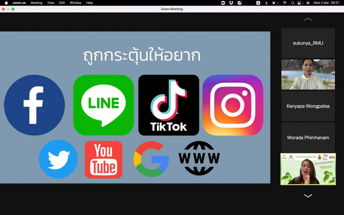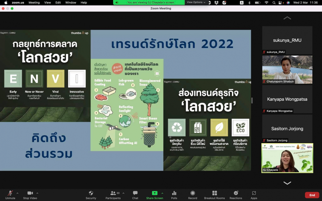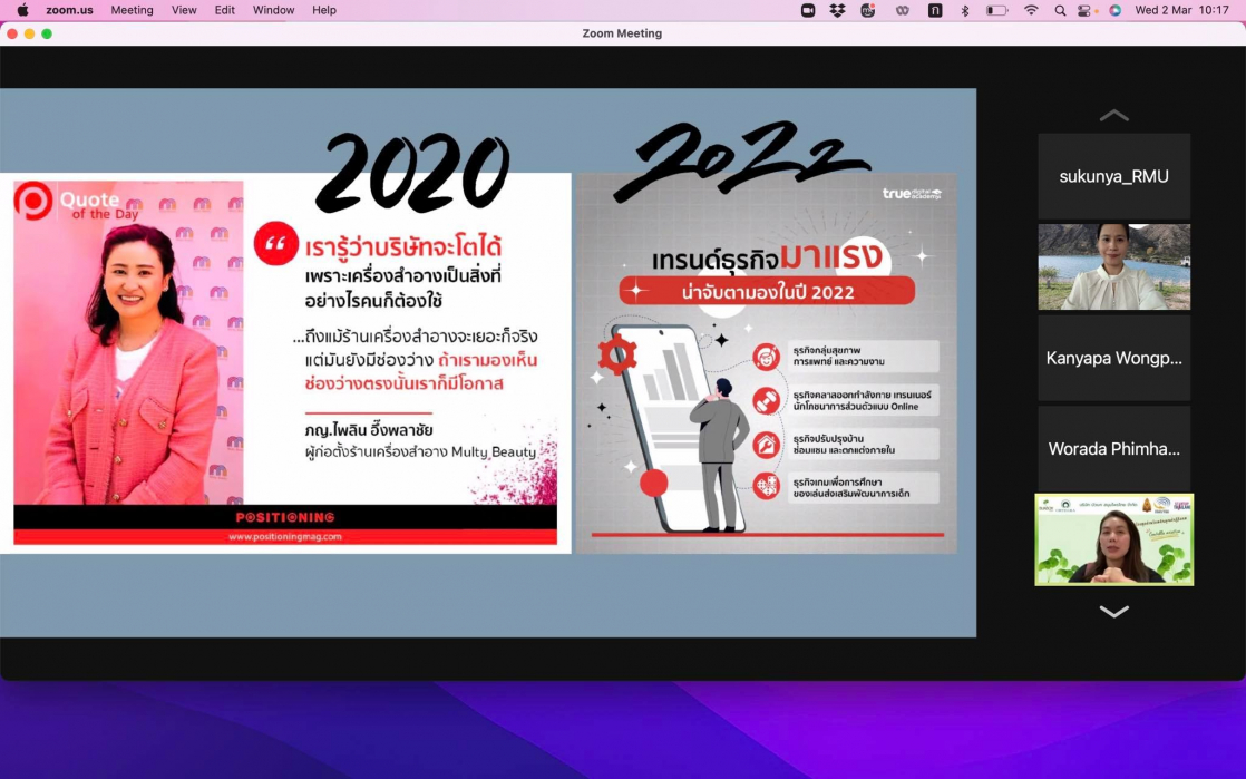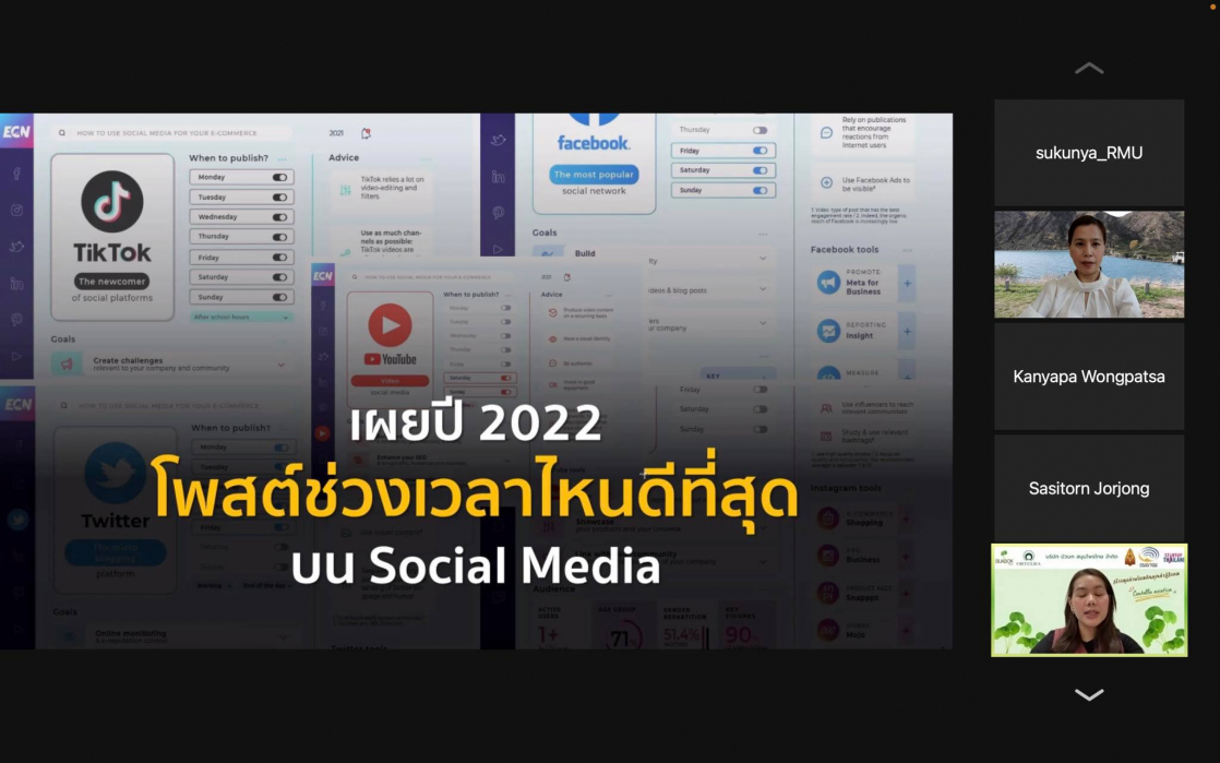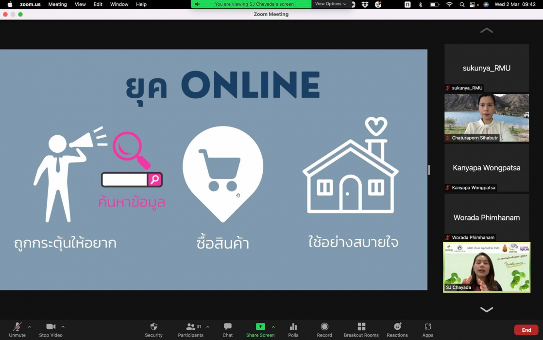 วันพุธ ที่ 2 มีนาคม 2564 เวลา 09.00-12.00 น. คณะสหวิทยาการ มหาวิทยาลัยขอนแก่น หลักสูตรนวัตกรรมการท่องเที่ยวและการบริการ จัดโครงการสัมมนาในหัวข้อ “การตลาดออนไลน์กับการปรับตัวในช่วงโควิด-19”และ“การตลาดเพื่อสังคมจากประสบการณ์ตรงการทำธุรกิจ” (รูปแบบออนไลน์) โดยเชิญ รองศาสตราจารย์ ดร.ชญาดา สุระวนิชกุล มาให้ความรู้และประสบการณ์ตรงจากการทำธุรกิจในรูปแบบการตลาดออนไลน์ในช่วงสถานการณ์โควิด-19 และมาแชร์ประสบการณ์การทำงานร่วมกับชุมชนโดยเน้นการให้คุณค่าคืนสู่ชุมชน การรับฟังสัมมนาในครั้งนี้นักศึกษาได้มุมมองจากวิทยากรในการทำธุรกิจจริงให้เห็นภาพทั้งกระบวนการทำการตลาดออนไลน์และการปรับรูปแบบทางธุรกิจจากสถานการณ์ปัจจัยภายนอกเช่น โควิด-19 นอกจากนั้นวิทยากรยังได้มีการให้ความรู้แนวโน้มเทรนด์โลกในการทำการตลาดพร้อมสอดแทรกแง่คิดและแรงบันดาลใจให้กับนักศึกษา การสัมมนาครั้งนี้มีการเปิดโอกาสให้กับผู้ที่สนใจจากภายนอกเข้าร่วมรับฟังแลกเปลี่ยนประสบการณ์ ซึ่งในช่วงปิดท้ายการสัมมนามีการสรุปและแชร์ความรู้แง่คิดที่ได้จากการสัมมนาครั้งนี้อีกด้วย