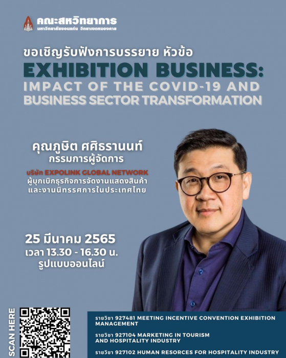 เมื่อวันศุกร์ ที่ 25 มีนาคม 2565 เวลา 13.30-16.30น. ที่ผ่านมา หลักสูตรการท่องเที่ยวและอุตสาหกรรมการบริการ คณะสหวิทยาการ มหาวิทยาลัยขอนแก่น จัดโครงการบรรยายในหัวข้อ “Exhibition Business: Impact of the Covid-19 and Business Sector Transformation” โดยเรียนเชิญ คุณภูษิต ศศิธรานนท์ กรรมการผู้จัดการ บริษัท Expolink Global Network ผู้บุกเบิกธุรกิจExhibition ในประเทศไทย มาให้ความรู้ด้านธุรกิจการจัดแสดงสินค้าและนิทรรศการ และถ่ายทอดประสบการณ์ตรงจากการทำธุรกิจ วิทยากรได้นำกรณีศึกษาการจัดexhibition ทั้งในประเทศและต่างประเทศที่น่าสนใจมาถ่ายทอดให้นักศึกษาและผู้เข้าร่วมที่สนใจได้รับฟัง รวมถึงสถานการณ์แนวโน้มและการปรับตัวทางธุรกิจจากสถานการณ์โควิด-19