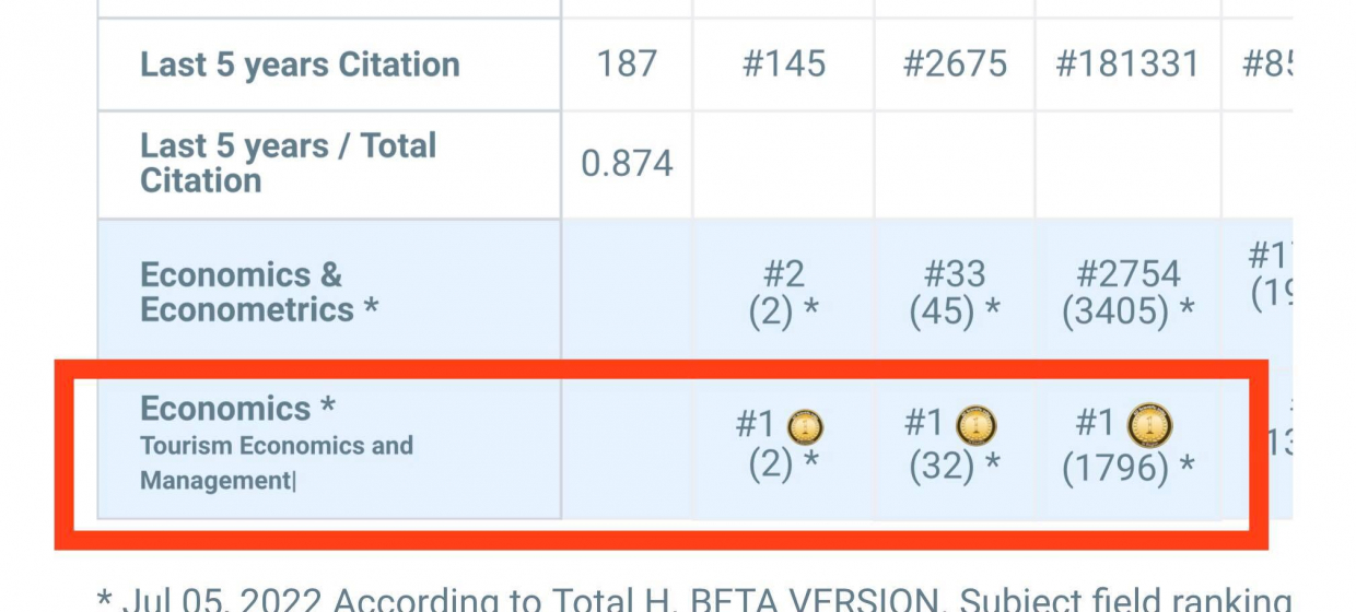 เมื่อเดือนมิถุนายน 2565 ที่ผ่านมา AD Scientific Index 2022 สถาบันจัดอันดับ World Scientist and University Rankings 2022 ชั้นนำของโลกได้รายงานผลการจัดอันดับในกลุ่มสาขาย่อยทางเศรษฐศาสตร์ คือ กลุ่มสาขาเศรษฐศาสตร์การท่องเที่ยวและการจัดการ (Tourism Economics and Management)