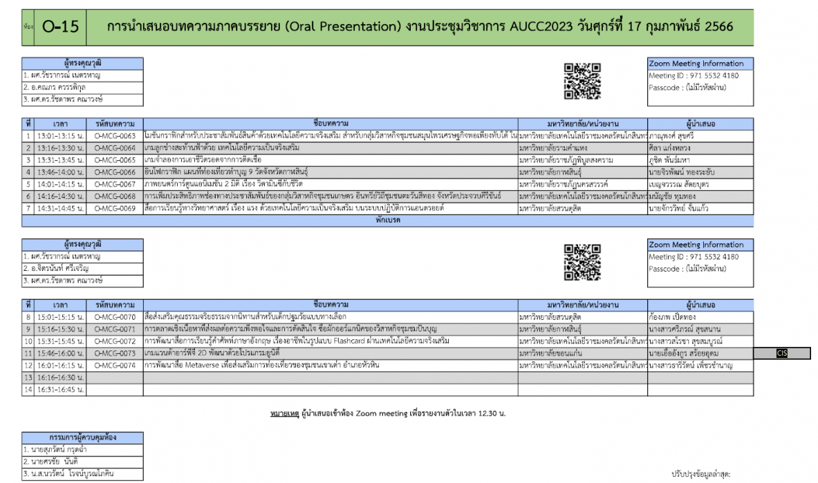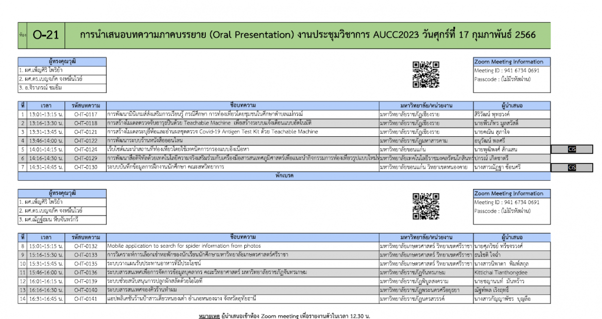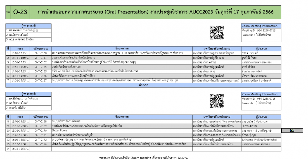 วันที่ 16 - 18 กุมภาพันธ์ 2566 หลักสูตรวิทยาการคอมพิวเตอร์และสารสนเทศ สาขาวิชาเทคโนโลยีและวิศวกรรมศาสตร์ คณะสหวิทยาการ มหาวิทยาลัยขอนแก่น ได้ส่งนักศึกษา ชั้นปีที่ 4 เข้าร่วมนำเสนอผลงานนวัตกรรมเทคโนโลยีคอมพิวเตอร์ ในการประชุมวิชาการระดับปริญญาตรีด้านคอมพิวเตอร์ภูมิภาคเอเชีย ครั้งที่ 11 (AUCC2023) ณ มหาวิทยาลัยราชภัฏนครสวรรค์ จ.นครสวรรค์ (Online Virtual) และได้เข้าร่วมนำเสนอผลงานนวัตกรรมเทคโนโลยีคอมพิวเตอร์ ในวันที่ 17 กุมภาพันธ์ 2566 ทั้งหมด จำนวน 7 กลุ่ม ดังตารางต่อไปนี้