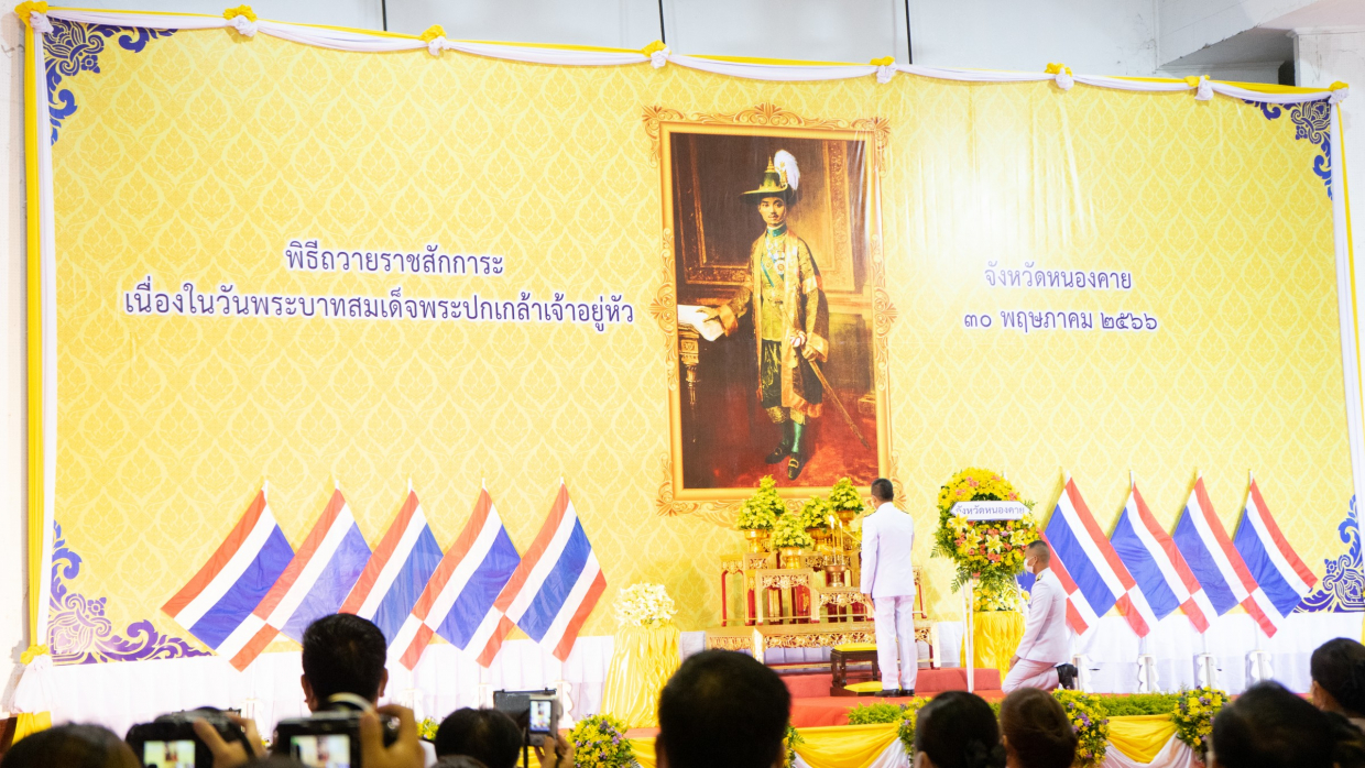 วันที่ 30 พฤษภาคม 2566 เวลา 07.30 น. ณ หอประชุมประจักษ์ศิลปาคม ศาลากลางจังหวัดหนองคาย คณะสหวิทยาการ มหาวิทยาลัยขอนแก่น ผู้ช่วยศาสตราจารย์ ดร.ณัฐพล ไตรเพิ่ม รองคณบดีคณะสหวิทยาการ มหาวิทยาลัยขอนแก่น พร้อมกับบุคลากรสำนักงานวิทยาเขตหนองคาย เข้าร่วมพิธีราชสักการะเนื่องในวันพระบาทสมเด็จพระปกเกล้าเจ้าอยู่หัว รัชกาลที่ 7 ซึ่งจังหวัดหนองคายได้จัดพิธีวางพวงมาลา และถวายบังคม ในโอกาสวันที่ระลึกถึงพระองค์และตรงกับวันคล้ายวันสวรรคต โดยมี นายราชันย์ ซุ้นหั้ว ผู้ว่าราชการจังหวัดหนองคาย เป็นประธานในพิธีฯ นำข้าราชการ พนักงาน เจ้าหน้าที่ ชมรม สมาคม ร่วมประกอบพิธีฯ จึงนับเป็นวันสำคัญอีกวันหนึ่งของประชาชน คนไทยทุกคนที่จะได้ร่วมน้อมรำลึกถึงพระมหากรุณาธิคุณของพะองค์ ที่ทรงบำเพ็ญประโยชน์นานัปการเพื่อพสกนิกรชาวไทย ทั้งยังคงเป็นพระมิ่งขวัญ สถิตอยู่ในใจของทุกคนสืบไป