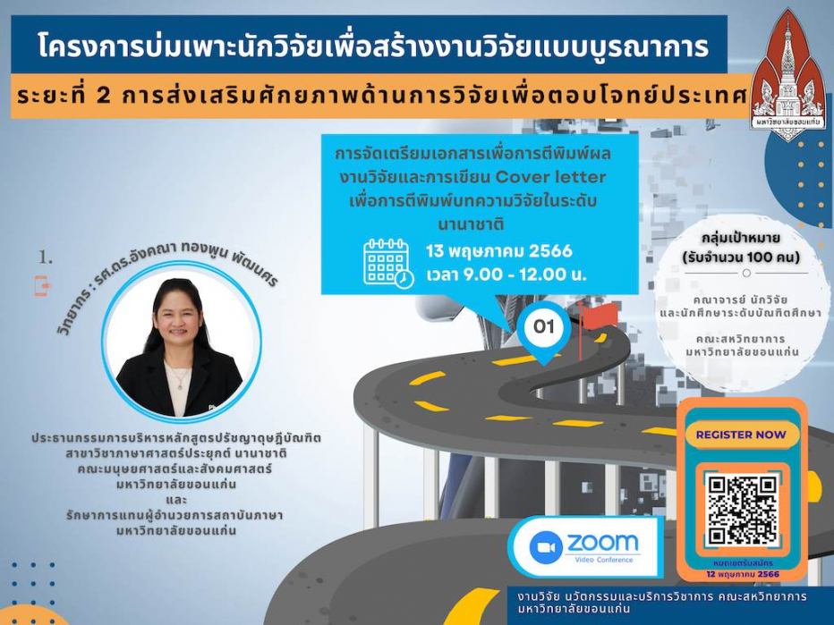 วันที่ 13 พฤษภาคม 2566 คณะสหวิทยาการ มหาวิทยาลัยขอนแก่น งานวิจัย นวัตกรรมและบริการวิชาการ ได้จัดโครงการบ่มเพาะนักวิจัยเพื่อสร้างงานวิจัยแบบบูรณาการ ระยะที่ 2 การส่งเสริมศักยภาพด้านการวิจัยเพื่อตอบโจทย์ประเทศ ในรูปแบบ “ออนไลน์” โดยมีผู้ช่วยศาสตราจารย์ ดร.สุนทรี บูชิตชน รองคณบดีคณะสหวิทยาการ เป็นประธานกล่าวเปิดงานโครงการในครั้งนี้