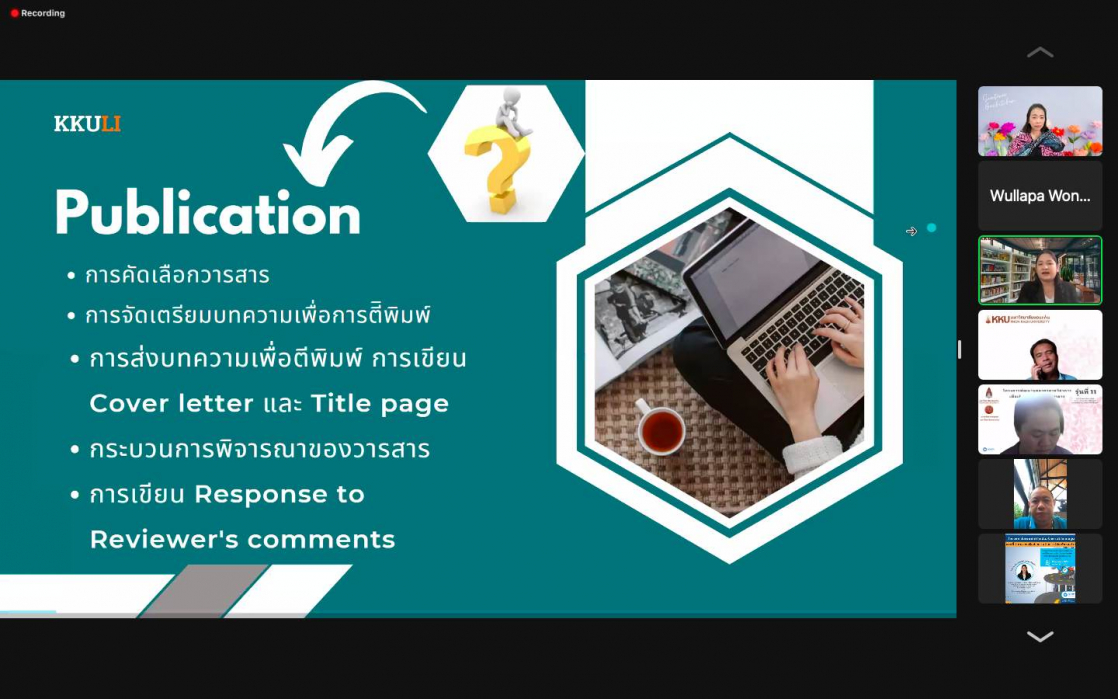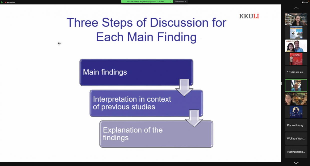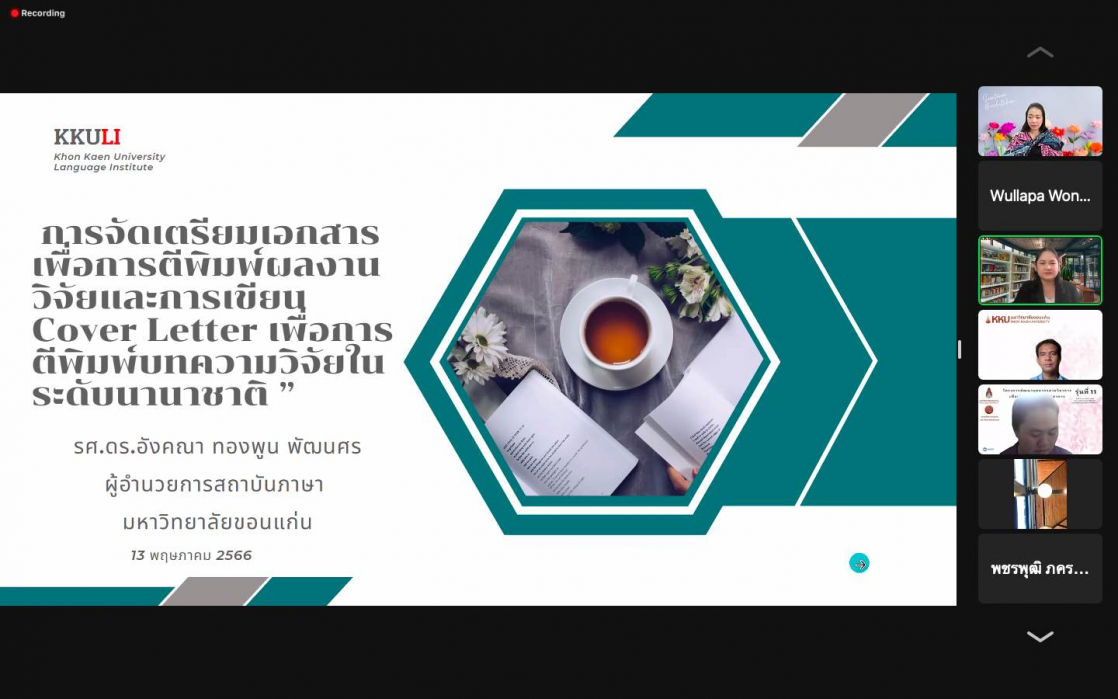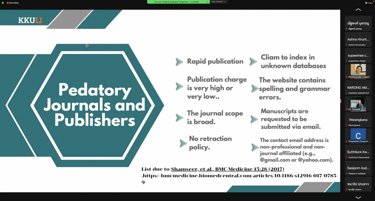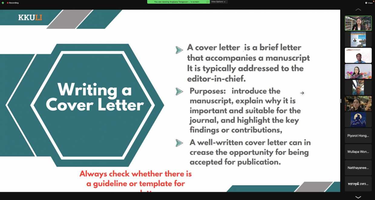 จากนั้นได้รับเกียรติจากวิทยากร รองศาสตราจารย์ ดร.อังคณา ทองพูน พัฒนศร ประธานกรรมการบริหารหลักสูตรปรัชญาดุษฏีบัณฑิต สาขาวิชาภาษาศาสตร์ประยุกต์ นานาชาติ คณะมนุษศาสตร์และสังคมศาสตร์ มหาวิทยาลัยขอนแก่น “อบรมในหัวข้อการจัดเตรียมเอกสารเพื่อการตีพิมพ์ผลงานวิจัยและการเขียน Cover Letter เพื่อการตีพิมพ์บทความวิจัยในระดับนานาชาติ” ในการจัดอบรมคณาจารย์คณะสหวิทยาการ มหาวิทยาลัยขอนแก่น ได้ประโยชน์และความรู้ จากการเข้าร่วมรับฟังอบรมในรูปแบบ “ออนไลน์” ในครั้งนี้