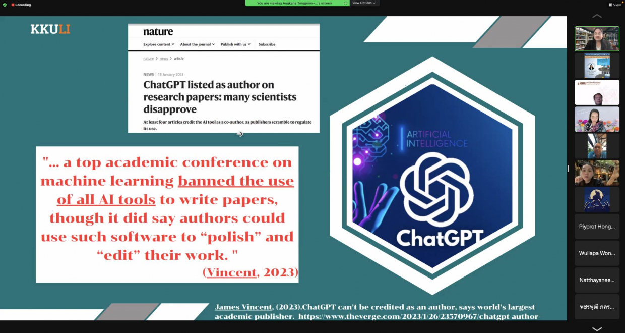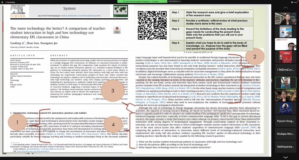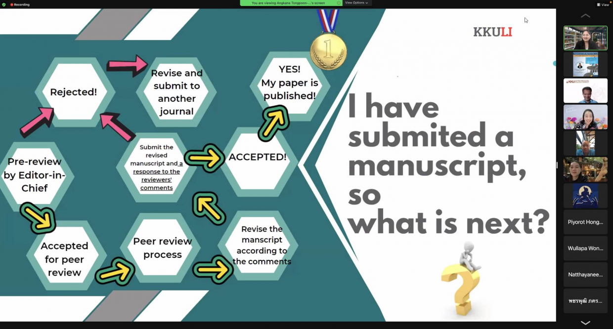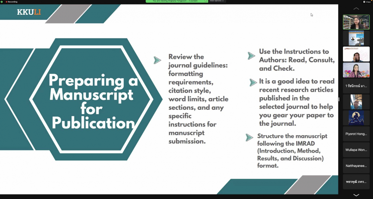 จากนั้นได้รับเกียรติจากวิทยากร รองศาสตราจารย์ ดร.อังคณา ทองพูน พัฒนศร ประธานกรรมการบริหารหลักสูตรปรัชญาดุษฏีบัณฑิต สาขาวิชาภาษาศาสตร์ประยุกต์ นานาชาติ คณะมนุษศาสตร์และสังคมศาสตร์ มหาวิทยาลัยขอนแก่น “อบรมในหัวข้อการจัดเตรียมเอกสารเพื่อการตีพิมพ์ผลงานวิจัยและการเขียน Cover Letter เพื่อการตีพิมพ์บทความวิจัยในระดับนานาชาติ” ในการจัดอบรมคณาจารย์คณะสหวิทยาการ มหาวิทยาลัยขอนแก่น ได้ประโยชน์และความรู้ จากการเข้าร่วมรับฟังอบรมในรูปแบบ “ออนไลน์” ในครั้งนี้