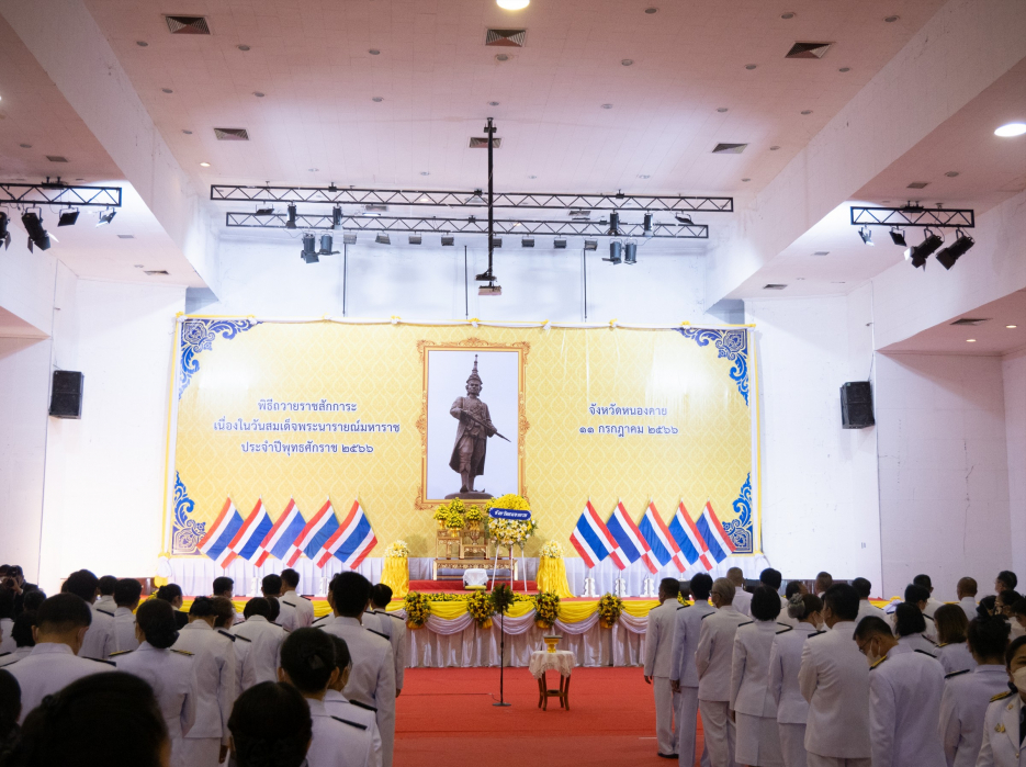 เมื่อช่วงเช้าวันที่ 11 กรกฎาคม 2566 คณะสหวิทยาการ มหาวิทยาลัยขอนแก่น นำโดยรองศาสตราจารย์ ดร.ภัทรียา ลาสุนนท์ รองคณบดีคณะสหวิทยาการพร้อมด้วยบุคลากร เข้าร่วมพิธีถวายราชสักการะเนื่องใน “วันสมเด็จพระนารายณ์มหาราช” ประจำปีพุทธศักราช 2566 ณ หอประชุมประจักษศิลปาคม ศาลากลางจังหวัดหนองคาย อ.เมือง จ.หนองคาย มีนายราชันย์ ซุ้นหั้ว ผู้ว่าราชการจังหวัดหนองคาย เป็นประธานในพิธีถวายราชสักการะ สมเด็จพระนารายณ์มหาราช เป็นพระราชโอรสในสมเด็จพระเจ้าปราสาททอง ขึ้นเสวยราชสมบัติเป็นพระมหากษัตริย์องค์ที่ 27 แห่งกรุงศรีอยุธยา เสวยราชย์ที่กรุงศรีอยุธยาได้ประมาณ 10 ปี จึงทรงมีพระราชดำริให้สถาปนาเมืองเก่า คือเมืองลวธานีหรือลพบุรีในปัจจุบันเป็นราชธานีที่สอง พระองค์ทรงเป็นกษัตริย์นักรบผู้กล้าหาญ ทรงปกครองอาณาประชาราษฎร์ด้วยทศพิธราชธรรม โดยเฉพาะอย่างยิ่งพระราชกรณียกิจที่เกี่ยวกับการเจริญสัมพันธไมตรีกับต่างประเทศ ทรงเป็นพระมหากษัตริย์เพียงพระองค์เดียวในบูรพาประเทศที่เป็นมิตรและสนิทสนมกับชาวยุโรป เป็นผลให้เกิดการถ่ายเทอารยธรรม ยังความเจริญ ในด้านการศึกษา วิทยาศาสตร์ การค้า และสถาปัตยกรรมแก่สยามประเทศ นอกจากนี้ พระองค์ยังทรงมีพระปรีชาในด้านศิลปะวรรณคดีเป็นอย่างดียิ่ง ได้ทรง พระราชนิพนธ์วรรณคดีไทยไว้หลายเรื่อง สมเด็จพระนารายณ์มหาราชเสด็จดำรงราชสมบัตินานถึง 32 ปี จึงทรงพระประชวร และเสด็จสวรรคต เมื่อวันที่ 11 กรกฎาคม พุทธศักราช 2231 สิริรวมพระชนมายุได้ 56 พรรษา