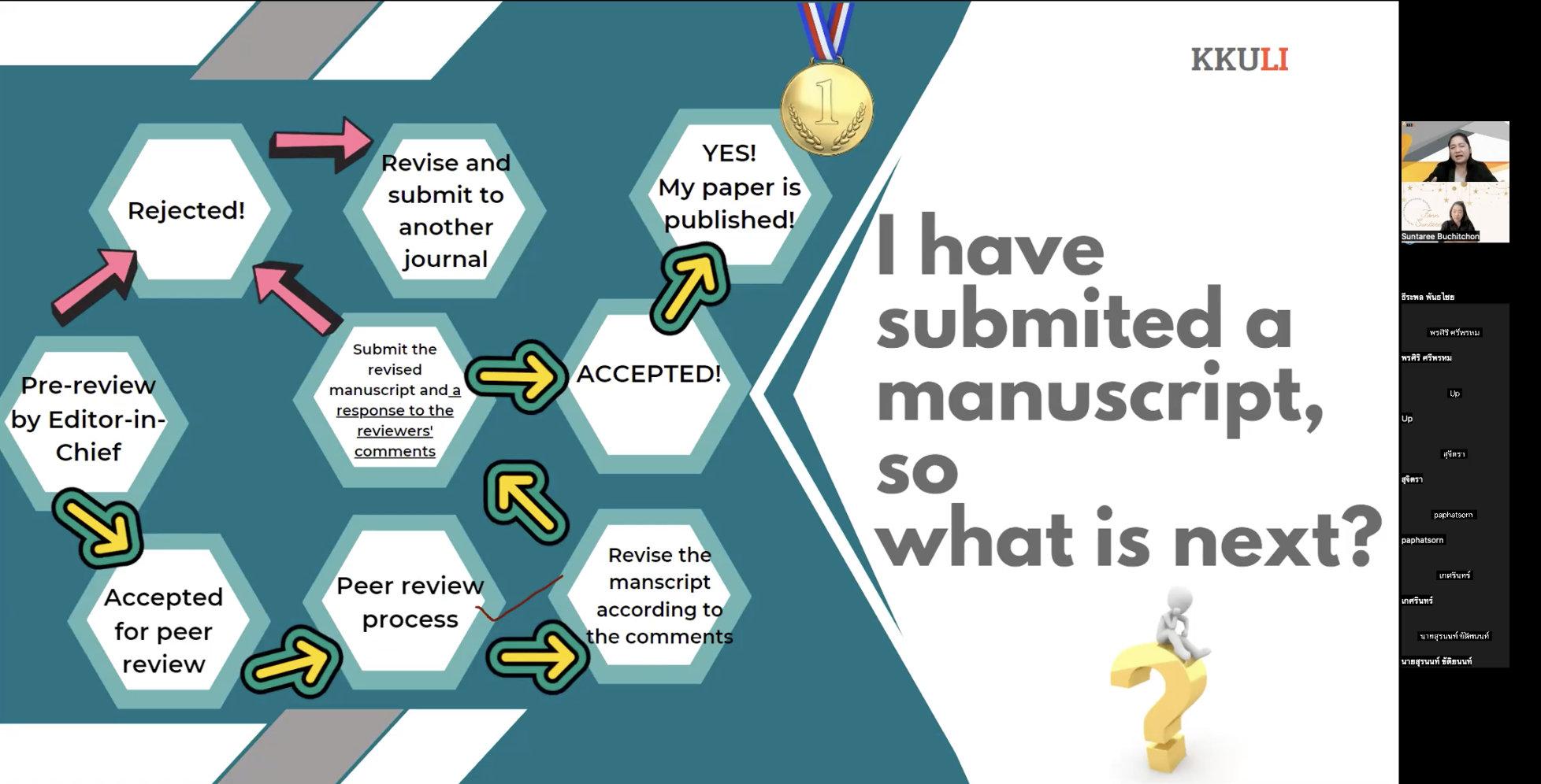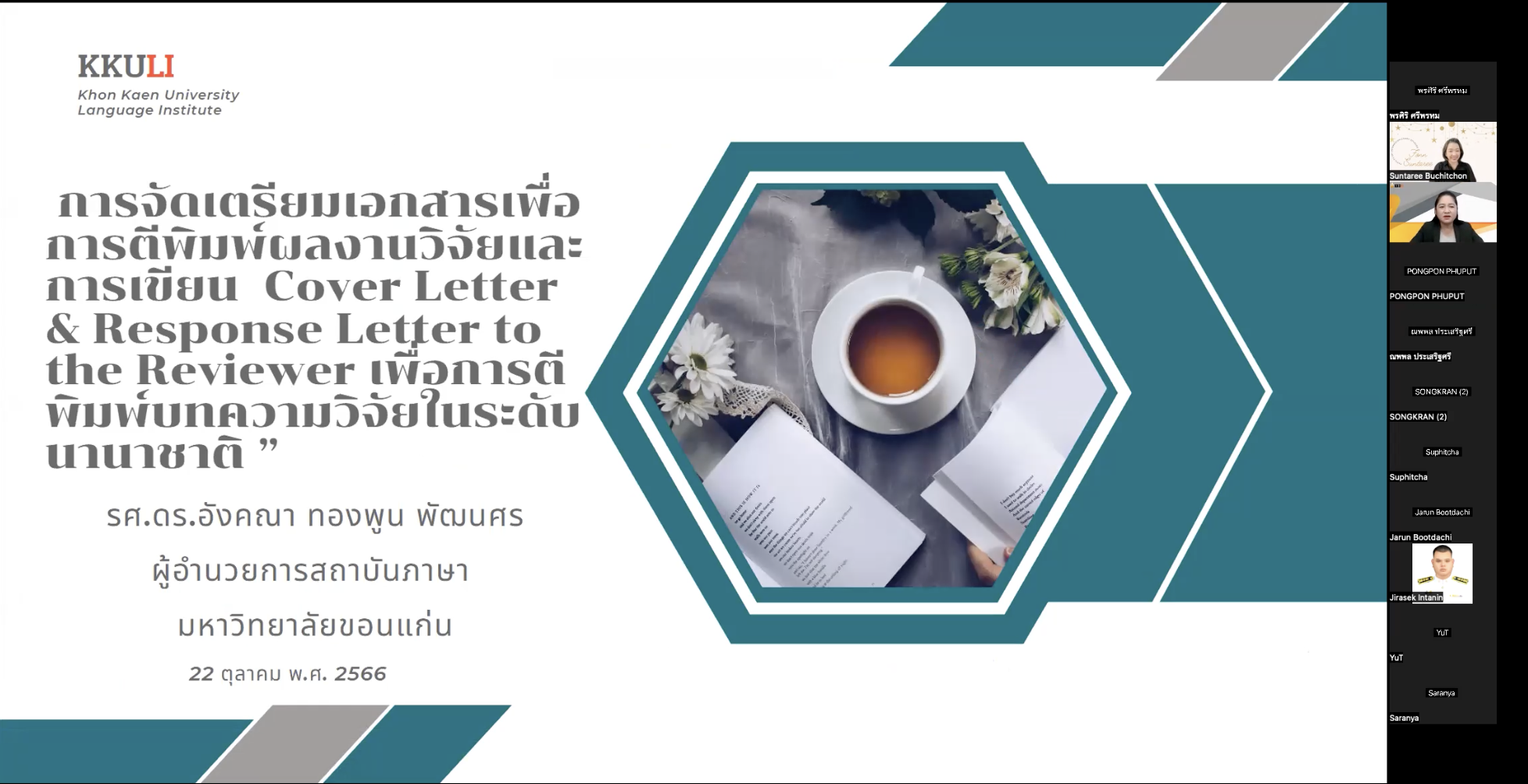 วันที่ 22 ตุลาคม 2566 ณ คณะสหวิทยาการ มหาวิทยาลัยขอนแก่น จัดโครงการบ่มเพาะนักวิจัยเพื่สร้างงานวิจัยใหม่ (ในรูปแบบออนไลน์) ระยะที่ 1 การเตรียมเอกสารเพื่อการตีพิมพ์ระดับนานาชาติ ผู้รับผิดชอบโครงการงานวิจัย นวัตกรรมและบริการวิชาการ ผู้ช่วยศาสตราจารย์ ดร.สุนทรี บูชิตชน รองคณบดีคณะสหวิทยาการ มหาวิทยาลัยขอนแก่น และได้รับเกียรติจากวิทยาการ รองศาสตราจารย์ ดร.อังคณา ทองพูน พัฒนศร ประธานกรรมการบริหารหลักสูตรปรัชญาดุษฎีบัณฑิต สาขาวิชาภาษาศาสตร์ประยุกต์ นานาชาติ อบรมเชิงปฏิบัติการ หัวข้อ “การจัดเตรียมเอกสารเพื่อการตีพิมพ์ผลงานวิจัยและการเขียน Cover letter เพื่อการตีพิมพ์บทความวิจัยในระดับนานาชาติ”