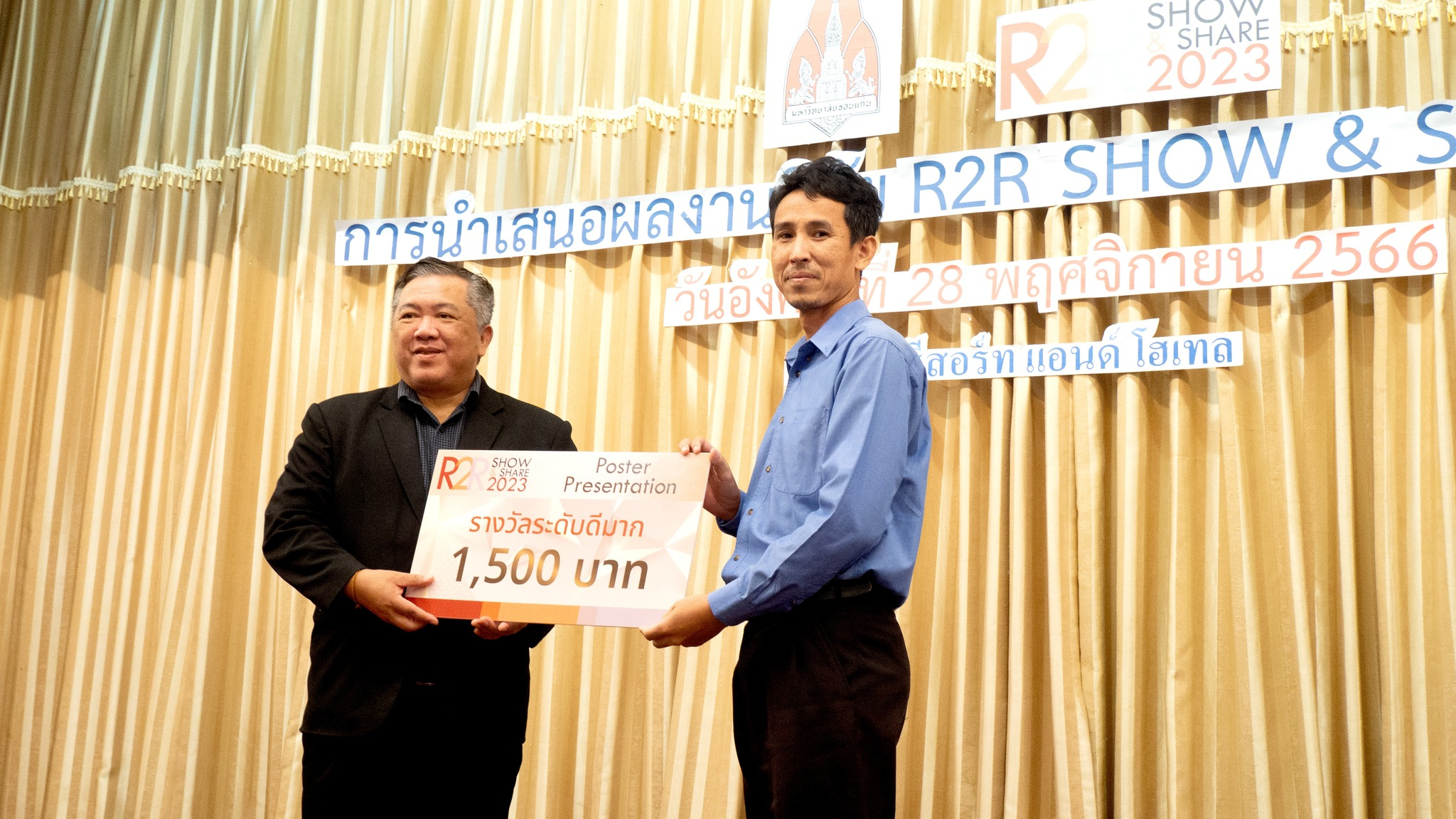 ได้รับ 2 รางวัล คือ “รางวัลระดับดีมาก” และ “รางวัลนำเทคนิค การนำเสนอผลงาน R2R รูปแบบ Poster Presentation”