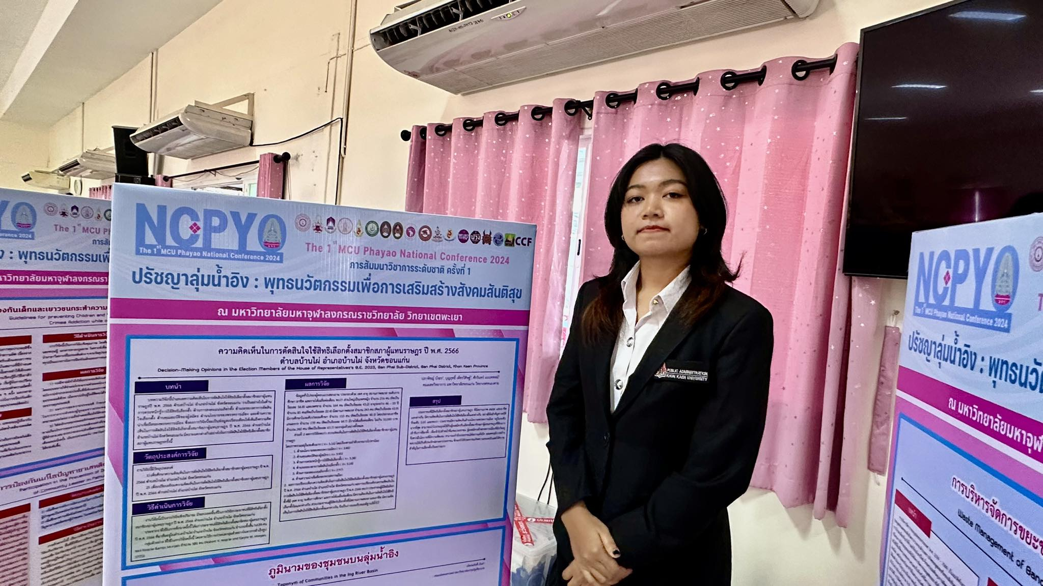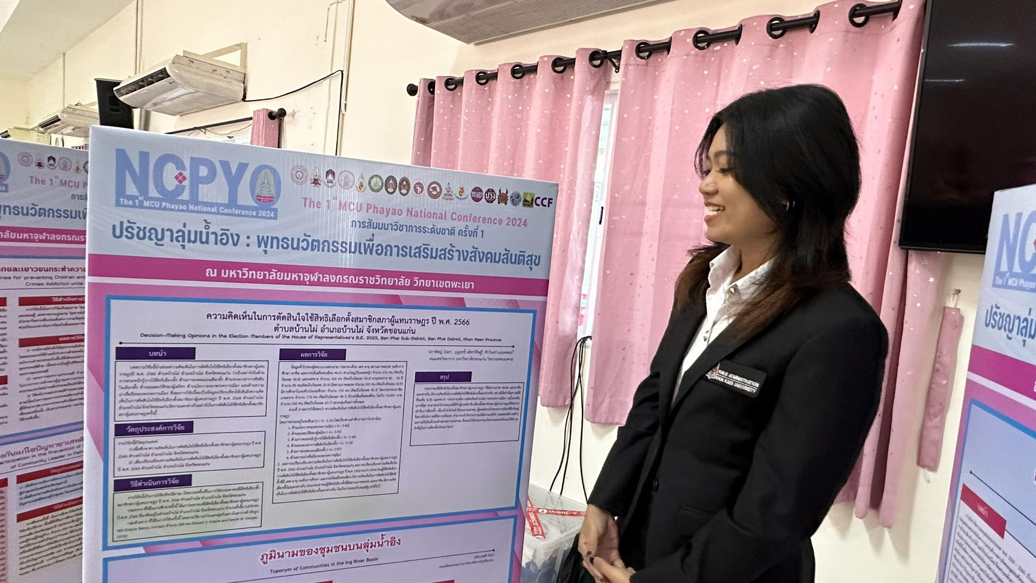 นางสาวปภาพิชญ์ บังอร นำเสนอผลงานวิจัยเรื่อง "ความคิดเห็นในการตัดสินใจใช้สิทธิเลือกตั้งสมาชิกสภาผู้แทนราษฎร ปี พ.ศ. 2566 ตำบลบ้านไผ่ อำเภอบ้านไผ่ จังหวัดขอนแก่น" โดยมี ผู้ช่วยศาสตราจารย์ ดร.บุญฤทธิ์ เพ็ชรวิศิษฐ์ และ รองศาสตราจารย์ ดร.ศักรินทร์ นนทพจน์ เป็นอาจารย์ที่ปรึกษา จากการเข้าร่วมงานดังกล่าวนางสาวปภาพิชญ์ บังอร กล่าวว่า " ตนเองเพิ่งได้เห็นรูปแบบงานประชุมวิชาการที่เป็นระบบและตามขั้นตอนนอกเหนือจากในคณะ ตลอดจนได้เห็นมุมมองการจัดนิทรรศการเกี่ยวกับบทความ โครงงานที่หลากหลาย อีกทั้งภายในงานยังมีการจัดประกวดวาดภาพอีกด้วย ที่แปลกตาที่สุดคือการแสดงก่อนเปิดงานสัมมนาวิชาการ นับได้ว่าเป็นประสบการณ์สำหรับตนเองครั้งหนึ่ง"