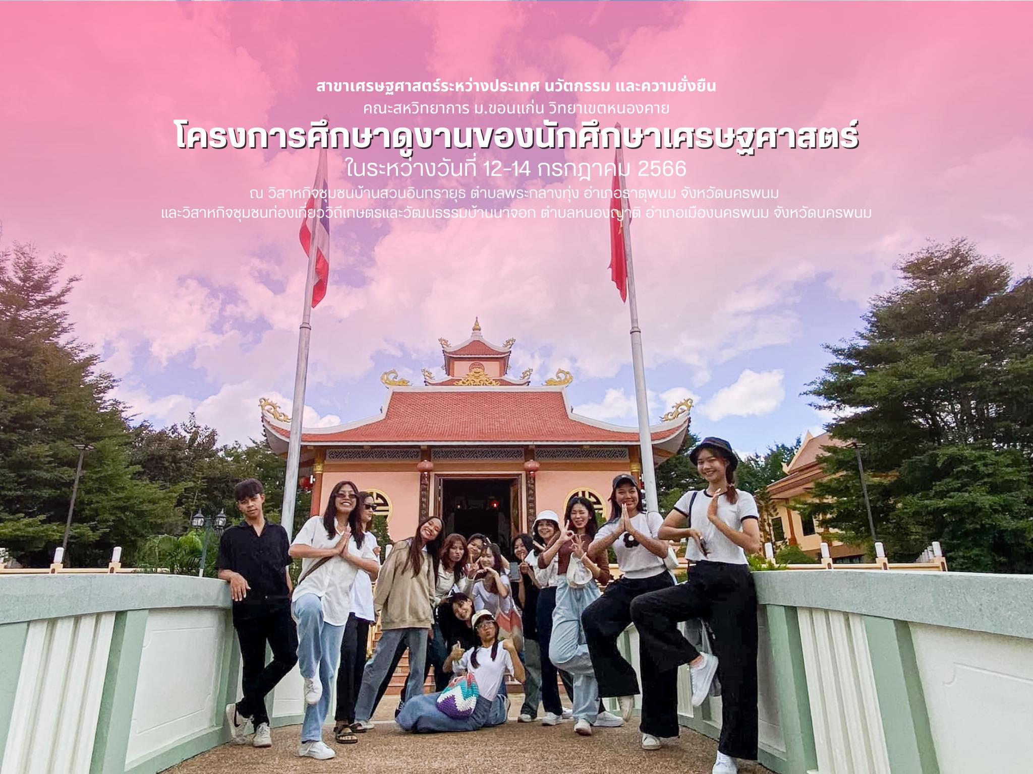 ระหว่างวันที่ 12 - 14 กรกฎาคม 2567 หลักสูตรเศรษฐศาสตร์ระหว่างประเทศ นวัตกรรม และความยั่งยืน คณะสหวิทยาการ มหาวิทยาลัยขอนแก่น ได้จัดทำ"โครงการศึกษาดูงานของนักศึกษาเศรษฐศาสตร์ฯ" โดยมีวัตถุประสงค์เพื่อให้นักศึกษาทีเข้าร่วมโครงการ ได้รับความรู้ ความเข้าใจ และวิธีการปรับเปลี่ยนวิถีชุมชนให้เป็นธุรกิจเพื่อขับเคลื่อนเศรษฐกิจภายในชุมชนจากการเรียนรู้ในประสบการณ์จริงด้วยการศึกษาดูงานตามกระบวนทัศน์ใหม่ ที่เน้นการเรียนรู้ของผู้เรียนอันเป็นส่วนหนึ่ง ของการจัดเรียนการสอนแบบเน้นสมรรถนะ (Competency-based method ) และเป็นการเพิ่มพูนองค์ความรู้และประสบการณ์และนำมาประยุกต์ใช้ในการเรียนการสอน รวมถึงการประกอบวิชาชีพทางด้านเศรษฐศาสตร์ ณ วิสาหกิจชุมชนท่องเที่ยววิถีเกษตรและวัฒนธรรมบ้านนาจอก ตำบลหนองญาติ อำเภอเมืองนครพนม จังหวัดนครพนม และวิสาหกิจชุมชนบ้านสวนอินทรายุธ ตำบลพระกลางทุ่ง อำเภอธาตุพนม จังหวัดนครพนม