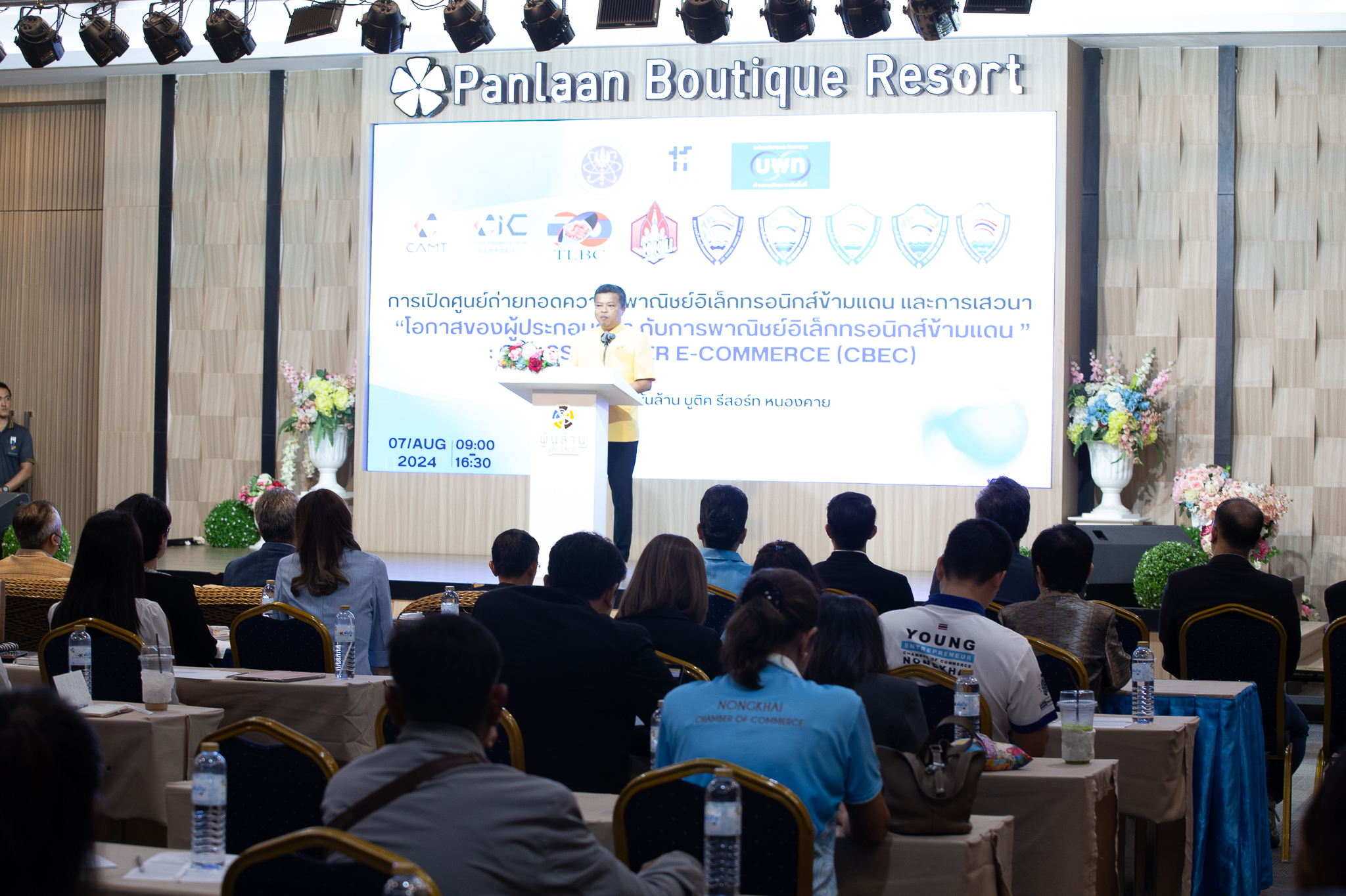 วันที่ 7-8 สิงหาคม 2567 ณ โรงแรมพันล้าน บูติค รีสอร์ท หนองคาย หน่วยบริหารจัดการทุนด้านการพัฒนาระดับพื้นที่ (บพท.) ศูนย์ China Intelligence Center ( CIC ) มหาวิทยาลัยเชียงใหม่ สภาธุรกิจไทย-ลาว หอการค้าจังหวัดหนองคาย หอการค้าจังหวัดอุดรธานี หอการค้าจังหวัดขอนแก่น หอการค้าจังหวัดมุกดาหาร หอการค้าจังหวัดอุบลราชธานี และคณะสหวิทยาการ มหาวิทยาลัยขอนแก่น ได้ร่วมกันจัดตั้งศูนย์ถ่ายทอดความรู้ด้านพาณิชย์อิเล็กทรอนิกส์ข้ามแดน ( Cross Border Ecommerce : CBEC ) เพื่อส่งเสริมและพัฒนา SME ให้มีความสามารถในการพัฒนาสินค้า และการจำหน่ายสินค้าไปยังตลาด สป.จีน อีกทั้งภายหลังพิธีเปิดศูนย์ฯ ดังกล่าวข้างต้นแล้ว มีการจัดเสวนาเพื่อแลกเปลี่ยนความคิดเห็น และการสัมมนาเชิงปฏิบัติการให้แก่ผู้ประกอบการ เพื่อให้เกิดความรู้และความเข้าใจในระบบการค้าของตลาดจีน โดยเฉพาะการค้าในระบบออนไลน์ในรูปแบบ Cross Border Ecommerce : CBEC