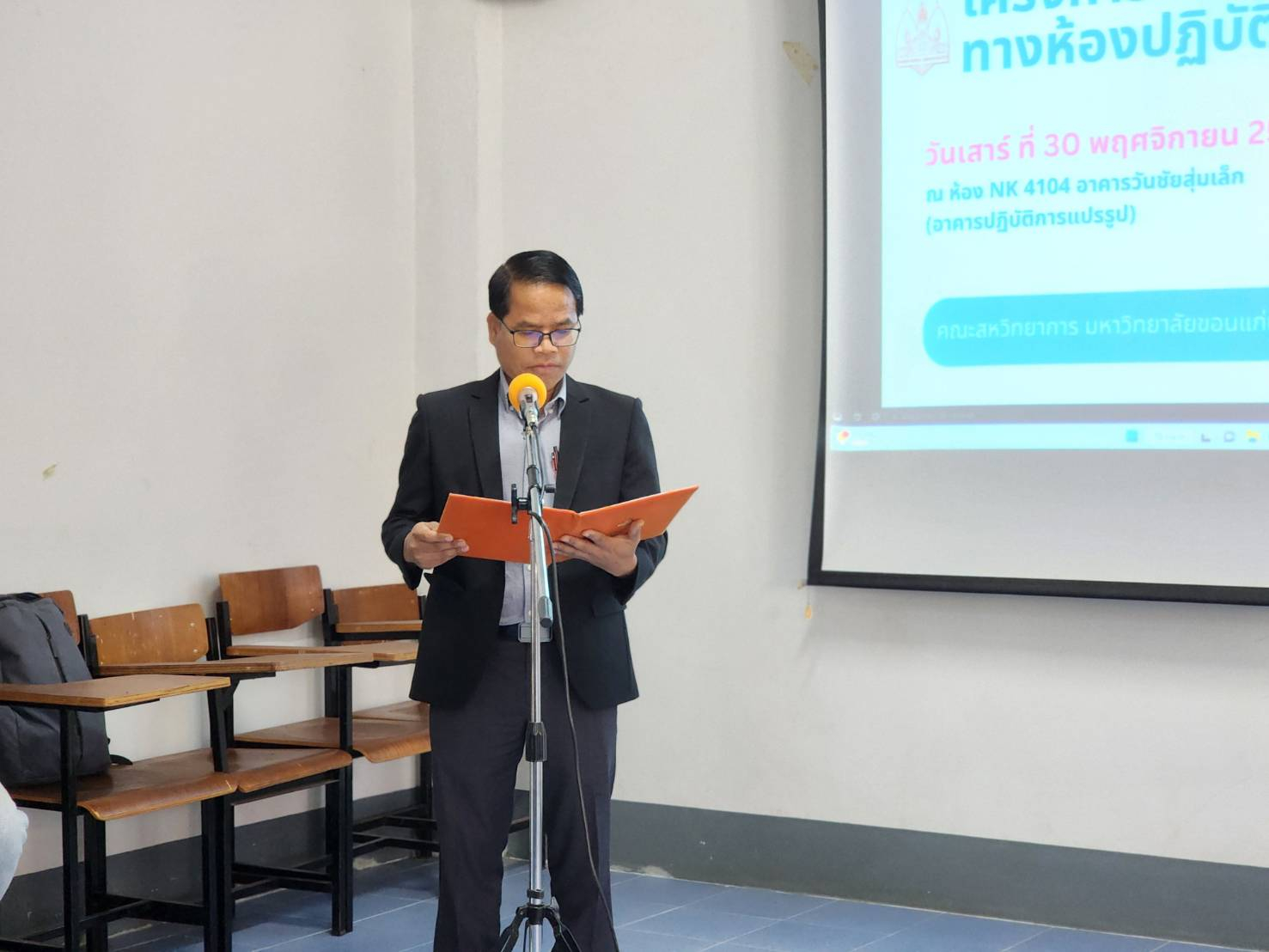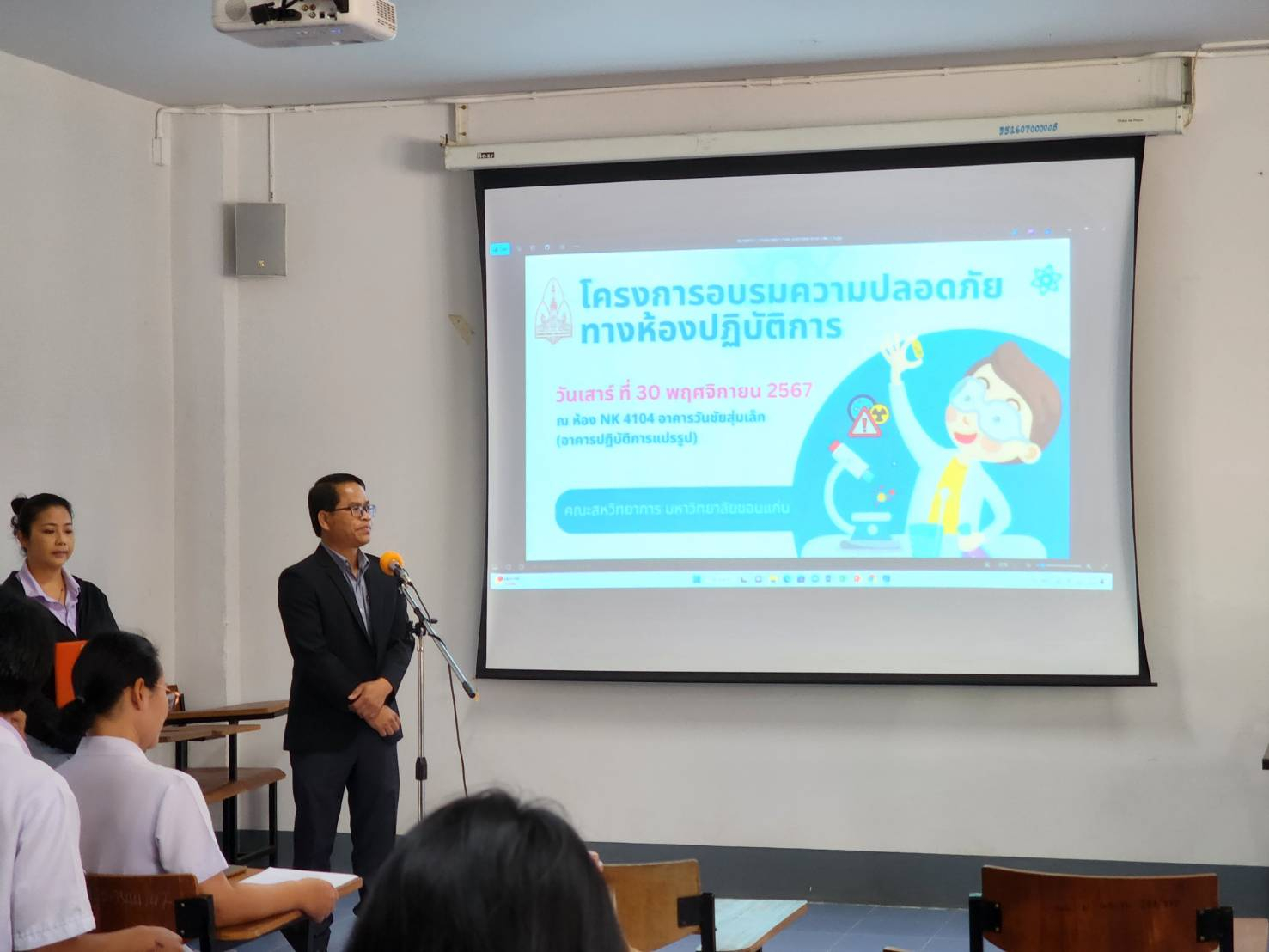 วันที่ 30 พฤศจิกายน 2567 ณ ห้อง NK4104 อาคารวันชัยสุ่มเล็ก (อาคารปฏิบัติการแปรรูป) คณะสหวิทยาการ มหาวิทยาลัยขอนแก่น รองศาสตราจารย์ ดร.ศุภชัย สมเพ็ชร ผู้ช่วยคณบดี เป็นประธานเปิดโครงการอบรมความปลอดภัยทางห้องปฏิบัติการ โครงการดังกล่าวนั้นมีความสำคัญอย่างยิ่ง เนื่องจากคณะสหวิทยาการ มีภาระกิจในการผลิตบัณฑิต รวมถึงการทำวิจัยของนักศึกษาและบุคลากร โดยการจัดการเรียนการสอนและการทำวิจัยต่าง ๆ ล้วนแล้วแต่ต้องปฏิบัติงานในห้องปฏิบัติการที่มีการใช้เครื่องมือและสารเคมี ซึ่งสิ่งเหล่านี้อาจก่อให้เกิดอันตรายต่อสุขภาพและสิ่งแวดล้อมได้หากใช้ไม่ถูกไม่วิธี