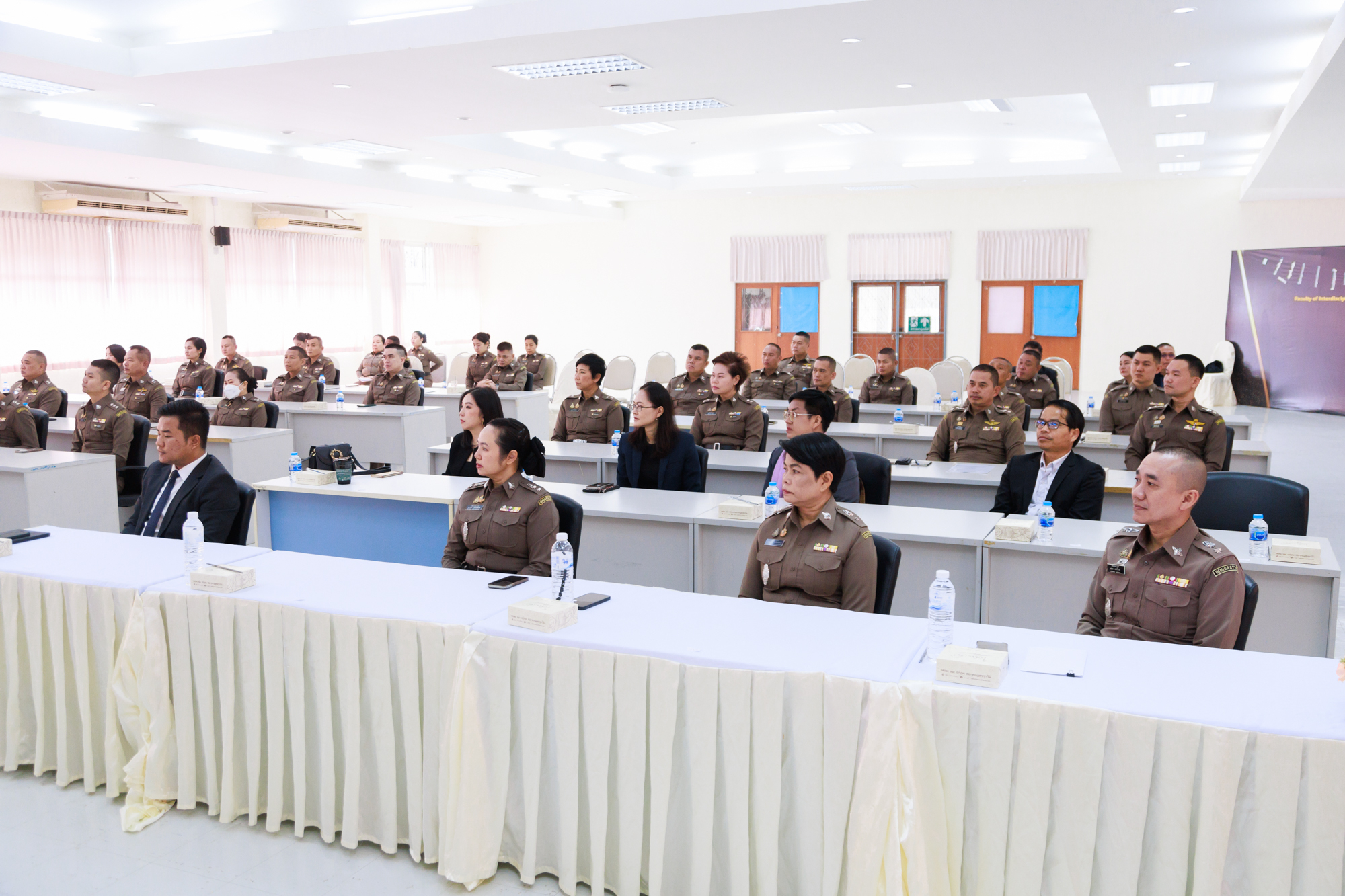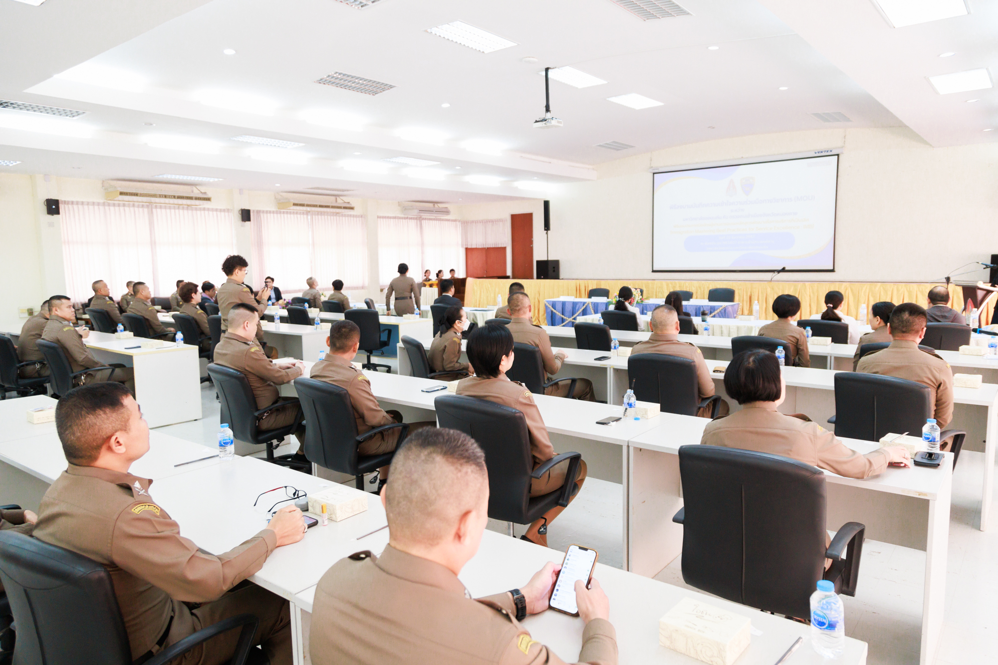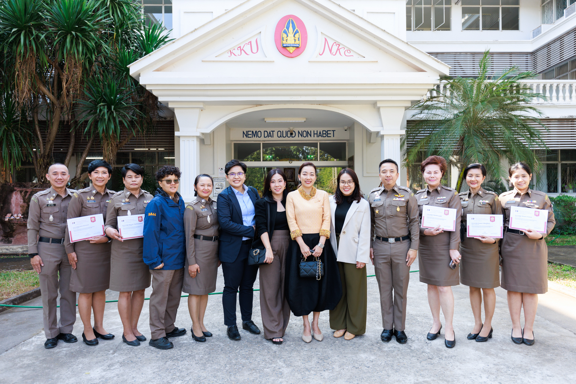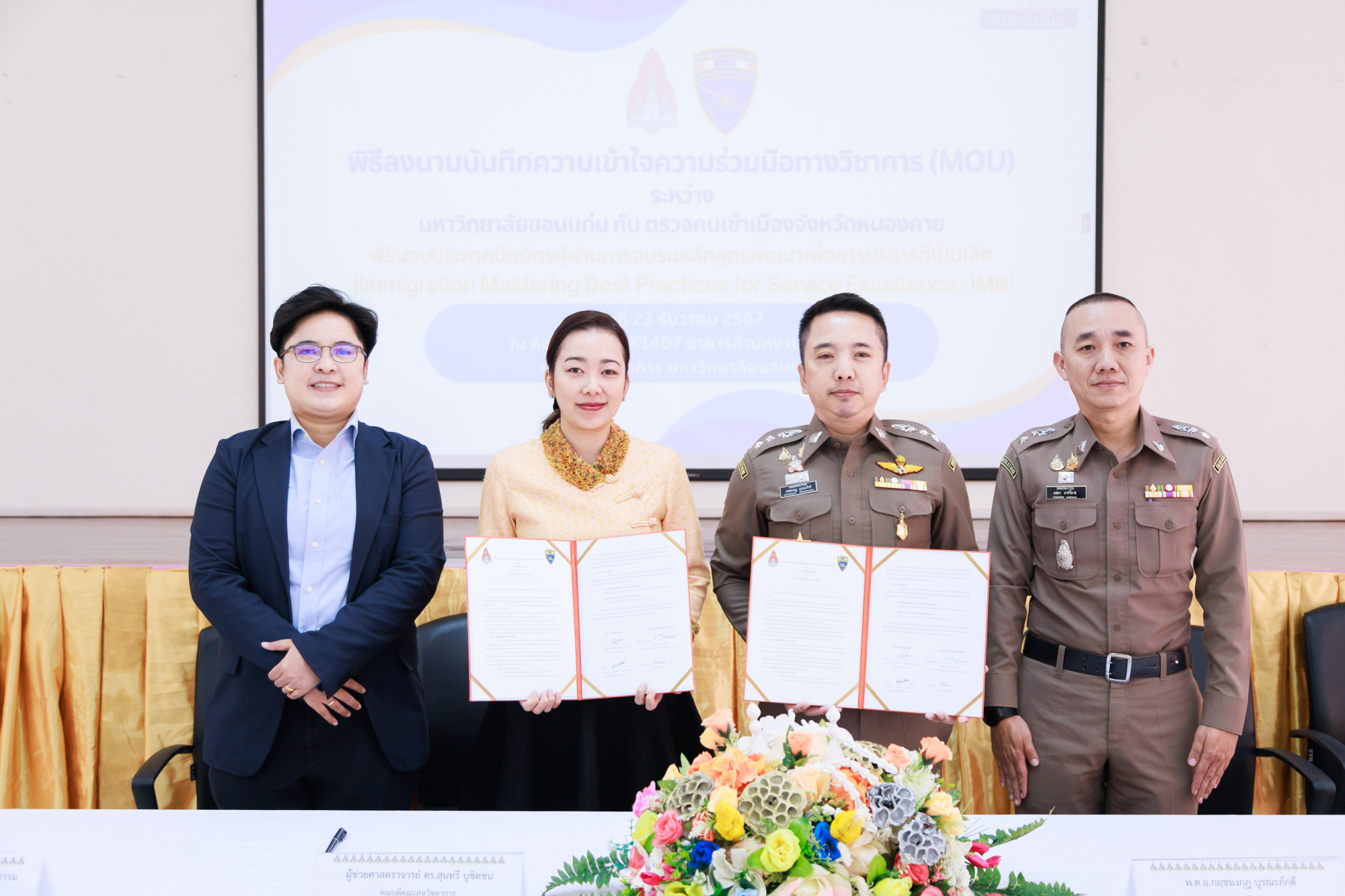 วันที่ 23 ธันวาคม 2567 ณ ห้องประชุม NK1407 อาคารสำนักงานบริหาร คณะสหวิทยาการ มหาวิทยาลัยขอนแก่น จัดพิธีลงนามบันทึกความเข้าใจความร่วมมือทางวิชาการ (MOU) ระหว่างมหาวิทยาลัยขอนแก่น กับ ตรวจคนเข้าเมืองจังหวัดหนองคาย เพื่อสร้างเครือข่ายความร่วมมือทางวิชาการและสถาบันต่างประเทศ ตรวจคนเข้าเมืองจังหวัดหนองคาย ได้จัดโครงการอบรมหลักสูตรพัฒนาเพื่อการเป็นเลิศ (Immigration Mastering Best Practices For Service Excellence : IMB) โดยความร่วมมือกับคณะสหวิทยาการ มหาวิทยาลัยขอนแก่น ปรึกษาหารือถอดแบบปัญหาจากการปฏิบัติงานตรวจคนเข้าเมืองจริง จัดอบรมภาคทฤษฎีและภาคปฏิบัติและประเมินผลคะแนนโดยคณะอาจารย์ผู้สอน แบ่งเป็นทั้งหมด 4 หลักสูตรวิชา ได้แก่ 1.ภาษาอังกฤษเพื่อการสื่อสารในบริบทตรวจคนเข้าเมือง 2.การสื่อสารและการบริการที่เป็นเลิศ 3.Data Storytelling 4.กฏหมายที่เกี่ยวข้องกับการปฏิบัติงาน ผู้เข้าอบรมจำนวน 60 นาย ใช้เวลาอบรมทั้งสิ้นกลุ่มละ 18 ชั่วโมง แบ่งเป็น 2 กลุ่ม รวมระยะเวลาอบรมโครงการ 6 สัปดาห์ ตั้งแต่วันที่ 19 ตุลาคม 2567 – วันที่ 27 พฤศจิกายน 2567