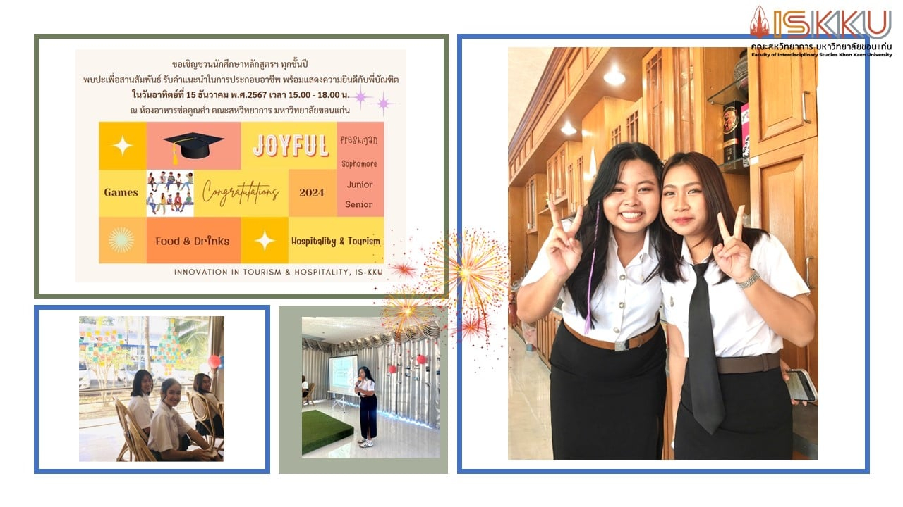 วันที่ 15 ธันวาคม 2567 ที่ผ่านมา เวลา 15.00 – 18.00 น. ณ ห้องอาหารช่อคูณคำ คณะสหวิทยาการ มหาวิทยาลัยขอนแก่น หลักสูตรบริหารธุรกิจบัณฑิต สาขาวิชานวัตกรรมการท่องเที่ยวและอุตสาหกรรมการบริการ สาขาบริหารธุรกิจ เป็นหลักสูตรที่มีเอกลักษณ์ เน้นการจัดการเรียนการสอนทั้งภาคทฤษฎีและภาคปฏิบัติ มีทั้งการฝึกประสบการณ์วิชาชีพทางการท่องเที่ยวและอุตสาหกรรมการบริการทั้งภายในประเทศและระหว่างประเทศ อีกทั้งยังเน้นการเรียนการสอนภาษาต่างประเทศทั้งภาษาอังกฤษและภาษาที่สาม โดยนักศึกษาสามารถสำเร็จการศึกษาได้ภายใน 3 ปีครึ่ง และสามารถประกอบวิชาชีพได้ทันทีหลังสำเร็จการศึกษา