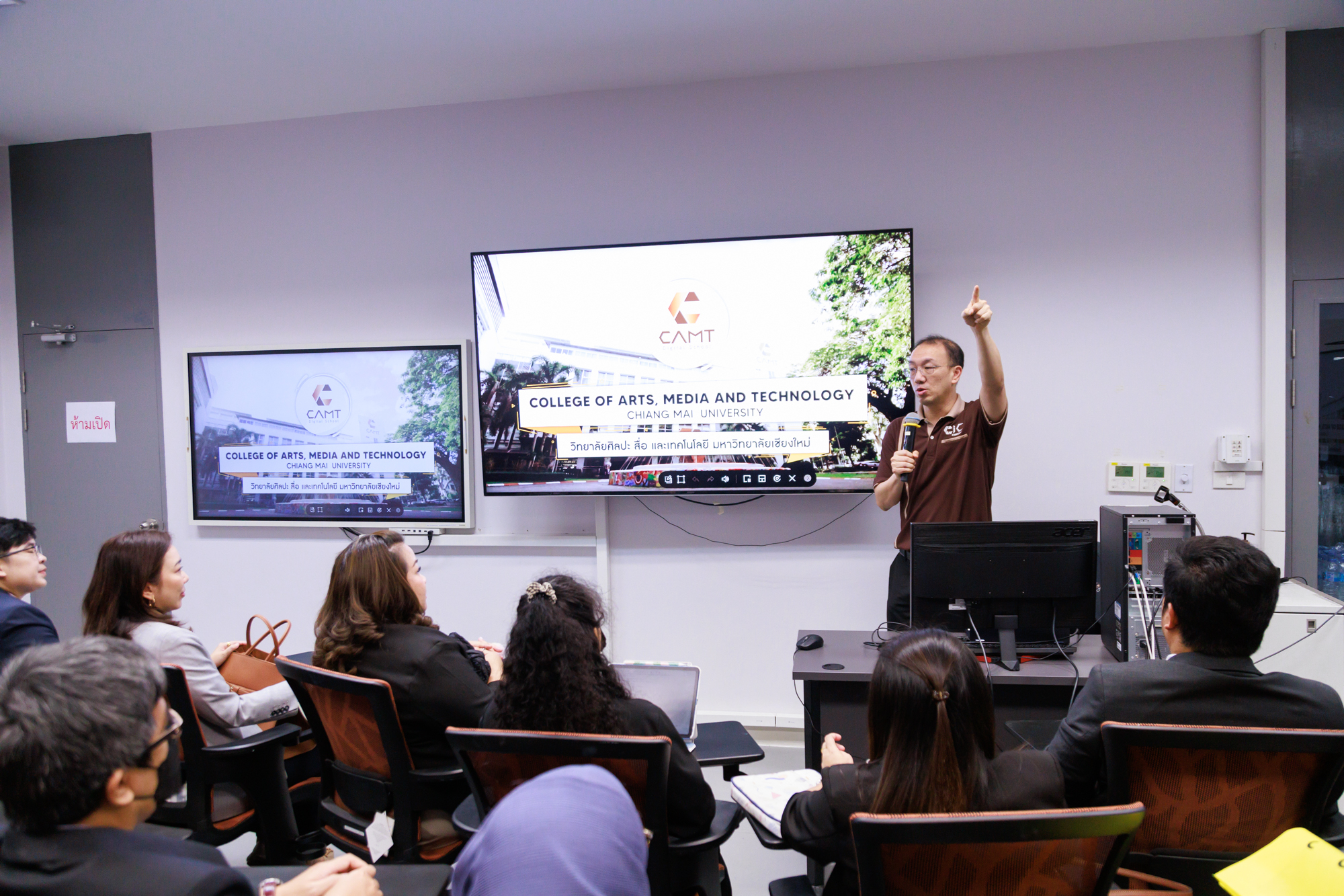 ต่อมาได้เข้าเยี่ยมชมและรับฟังการบรรยายในด้านการสร้างสรรค์นวัตกรรมสื่อทางเลือกใหม่ การเรียนรู้ด้านเทคโนโลยี AI เพื่อสร้างความรู้ความเข้าใจเกี่ยวกับแผนการเรียนการสอนในรูปแบบสื่อเทคโนโลยีออนไลน์ โดยได้รับการต้อนรับจาก ดร.ดนัยธัญ พงษ์พัชราธรเทพ รองคณบดีฝ่ายบริการสังคมและวิจัย ณ วิทยาลัยศิลปะ สื่อ และเทคโนโลยี มหาวิทยาลัยเชียงใหม่