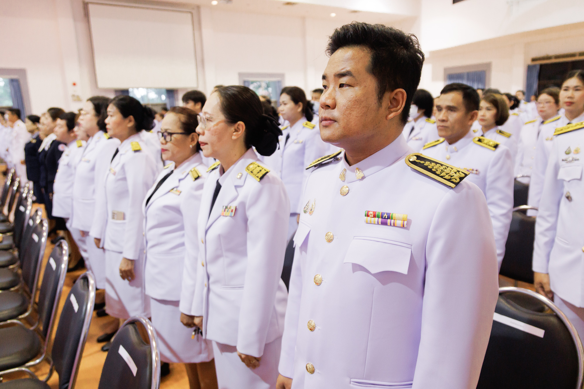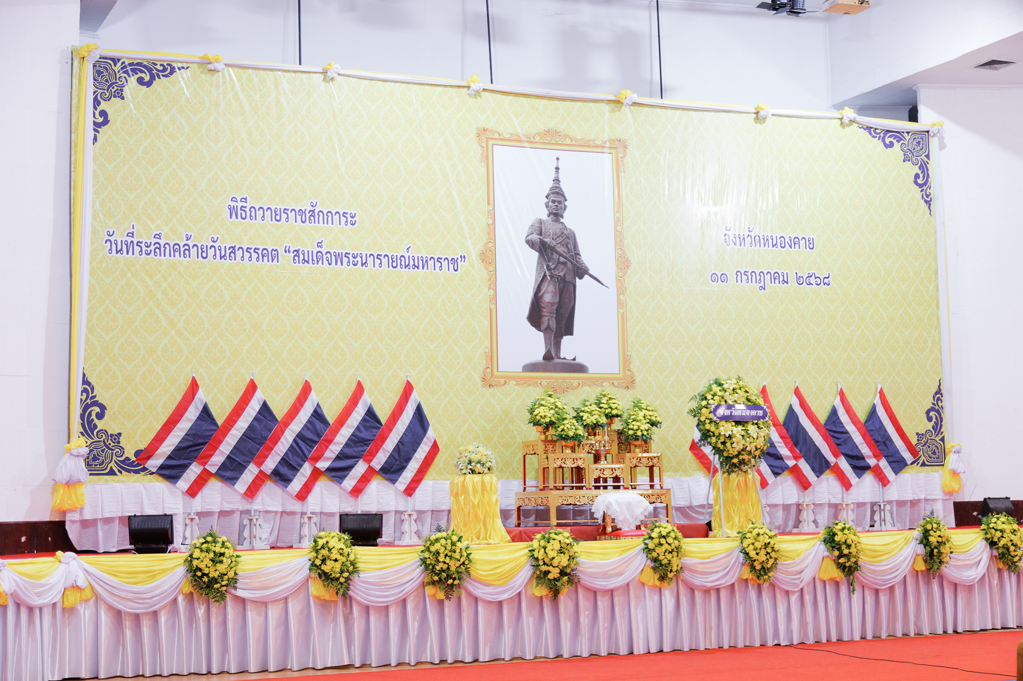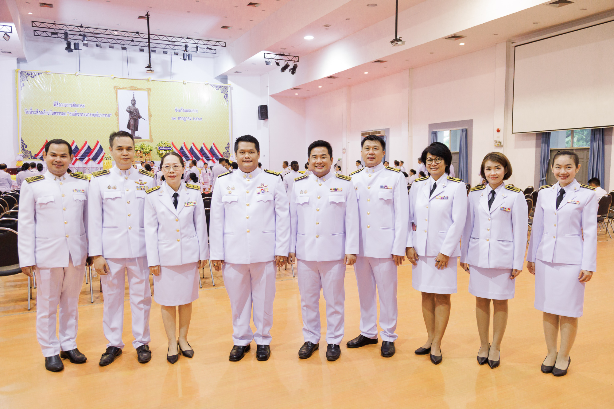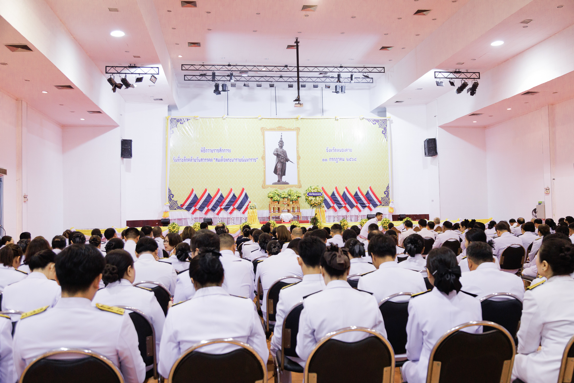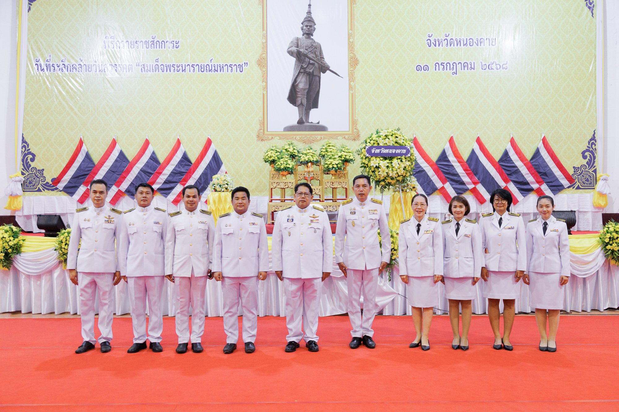 วันที่ 11 กรกฎาคม 2568 ณ หอประชุมประจักษศิลปาคม ศาลากลางจังหวัดหนองคาย คณะสหวิทยาการ มหาวิทยาลัยขอนแก่น นำโดย อาจารย์จักรวาล กลีบบัว รองคณบดีคณะสหวิทยาการ พร้อมบุคลากร เข้าร่วมพิธีวางพวงมาลาและถวายราชสดุดี เนื่องในวันที่ระลึกคล้ายวันสวรรคต “สมเด็จพระนารายณ์มหาราช” ประจำปีพุทธศักราช 2568 ภายในพิธี นายสมภพ สมิตะสิริ ผู้ว่าราชการจังหวัดหนองคาย เป็นประธานในพิธี วางพานพุ่มถวายราชสักการะหน้าพระบรมฉายาลักษณ์ และนำกล่าวถวายราชสดุดีเฉลิมพระเกียรติ พร้อมด้วยหัวหน้าส่วนราชการ ตุลาการ อัยการ ข้าราชการพลเรือน ทหาร ตำรวจ ผู้บริหารองค์กรปกครองส่วนท้องถิ่น และสมาชิกองค์กรต่าง ๆ ร่วมพิธี