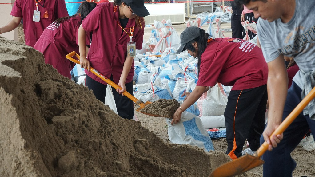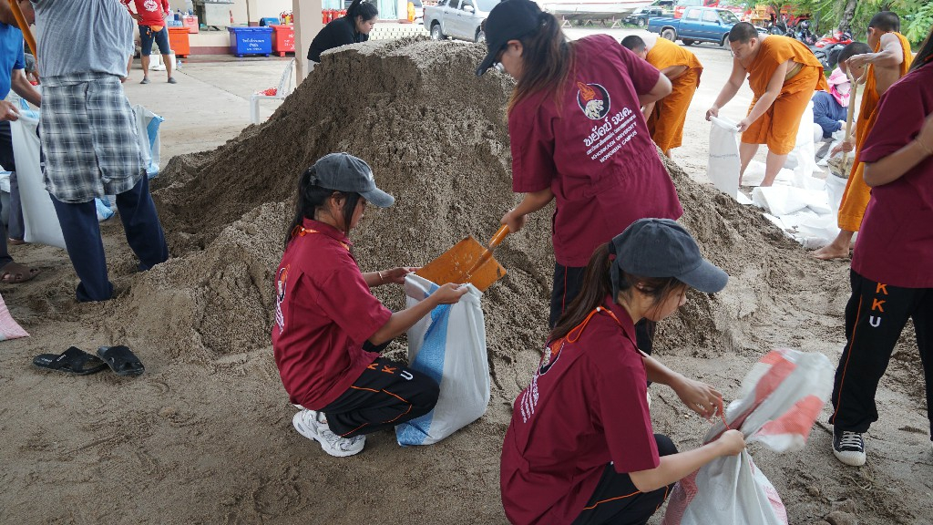 นอกจากนี้ ยังมี นศ.จากคณะสหวิทยาการบางส่วนได้ลงพื้นที่ตามจุดเฝ้าระวังต่างๆ ในเขตเทศบาลเมืองหนองคาย เพื่อร่วมกับเจ้าหน้าที่เทศบาลฯ และชาวบ้านผู้มีจิตอาสากรอกทรายใส่กระสอบ ซึ่งกระสอบทรายเหล่านี้จะถูกนำไปใช้เป็นแนวกั้นน้ำ เพื่อป้องกันน้ำทะลักเข้าท่วมอาคารบ้านเรือนและพื้นที่ต่างๆ ตามแนวแม่น้ำโขง