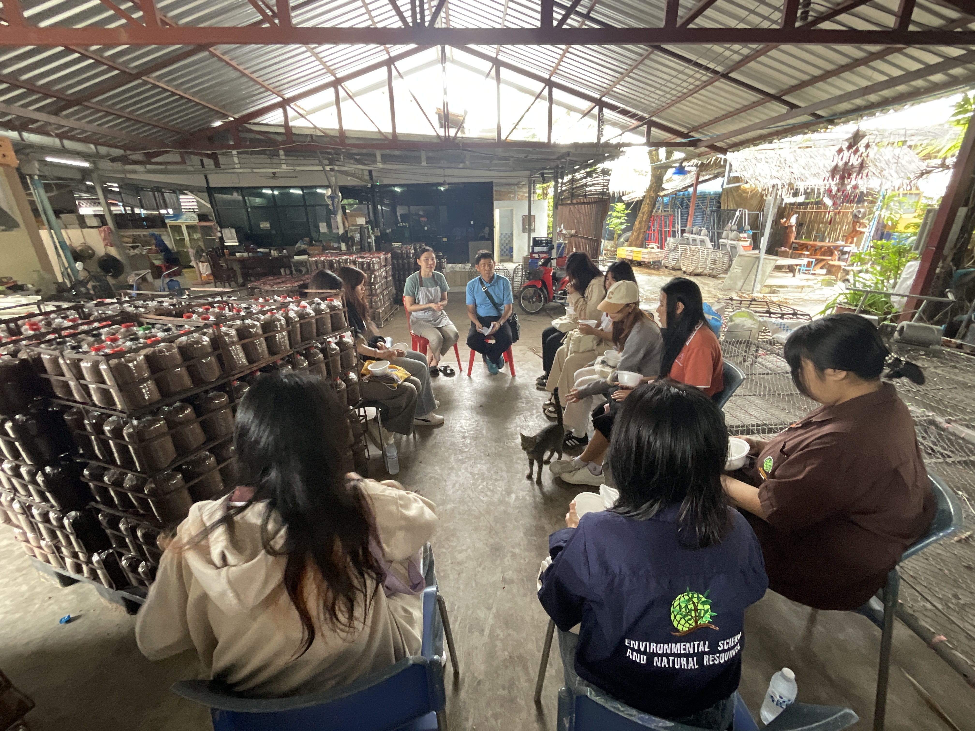 วันที่ 12 ก.ย. 68 นักศึกษาชั้นปีที่ 3 สาขาวิชาวิทยาศาสตร์สิ่งแวดล้อมและทรัพยากรธรรมชาติ และนักศึกษาชั้นปีที่ 4 สาขาเศรษฐศาสตร์ นัวตกรรม และความยั่งยืน คณะสหวิทยาการ มหาวิทยาลัยขอนแก่น ภายใต้วิชา IS164813 เทคโนโลยีชีวภาพจากจุลินทรีย์เพื่อการดำรงชีวิต โดยผู้ช่วยศาตราจารย์สุทธิลักษณ์ ขวัญไตรรัตน์ ผู้สอน และนายวิทยา หอมหวน นักวิทยาศาสตร์และผู้ประสานงานการดูงาน ได้รับการสนับสนุนให้เข้าศึกษาดูงาน ณ ฟาร์มเห็ดแม่โจ้ อ. ท่าบ่อ จังหวัดหนองคาย และได้รับเกียรติจากวิทยากรเจ้าของฟาร์ 3 ท่าน ได้แก่ อาจารย์พิรุณ บุญซี่อ คุณหยาดพิรุณ บุญซื่อ เจ้าของกิจการ และคุณชลดา ชิ้นอ่อน ได้บรรยายทั้งวิชาการเพาะเลี้ยงเห็ดครบวงจร และประสบการณ์ตรงจากเด็กสายวิทย์สาขาจุลชีววิทยา สู่เจ้าของกิจการที่เริ่มจากการสร้างโอกาสให้ตัวเอง จนได้รับทุนสนับสนุนจาก สำนักงานพัฒนาวิทยาศาสตร์และเทคโนโลยีแห่งชาติ (สวทช.) และทุน Star-up จากสำนักงานนวัตกรรมแห่งชาติ (องค์กรมหาชน) และยังนำศึกษาดูงานในส่วนต่าง ๆ ทุกขั้นตอนแก่นักศึกษา รวมทั้งนวัตกรรมการเพาะเลี้ยงที่เกิดจากการศึกษาวิจัยภายในฟาร์มเพื่อแก้ปัญหาและพัฒนา