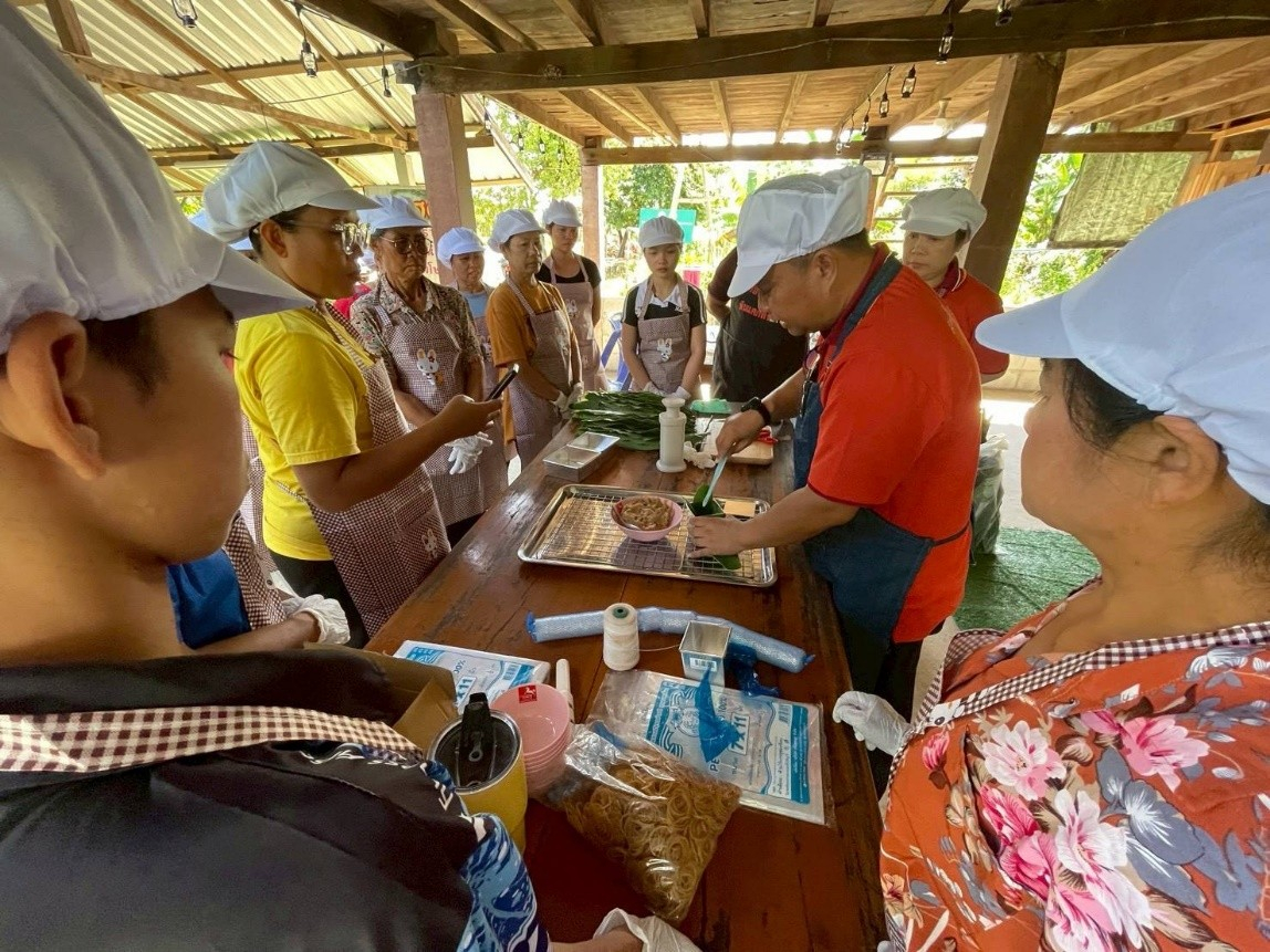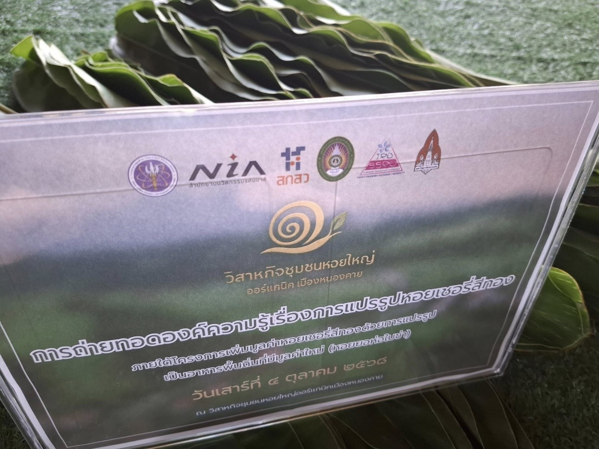 นำโดย ผู้ช่วยศาสตราจารย์ ดร.มัลลิกา จันทรังษี หัวหน้าโครงการ พร้อมด้วยทีมวิจัย นายสุพีระ วรแสน และ นายศรัณย์ภัทร บุณยกรสกุล ได้ถ่ายทอดเทคนิคการแปรรูปหอยเชอรี่สีทองให้กับกลุ่มเกษตรกรของ วิสาหกิจชุมชนหอยใหญ่ออร์แกนิคเมืองหนองคาย โดยมุ่งเน้นที่การสร้างนวัตกรรมอาหารพื้นถิ่น คือ "หอยยอห่อใบข่า" ซึ่งเป็นการแปรรูปหอยเชอรี่สีทองให้กลายเป็นสินค้าที่มีมูลค่าใหม่และพร้อมสำหรับการบริโภค