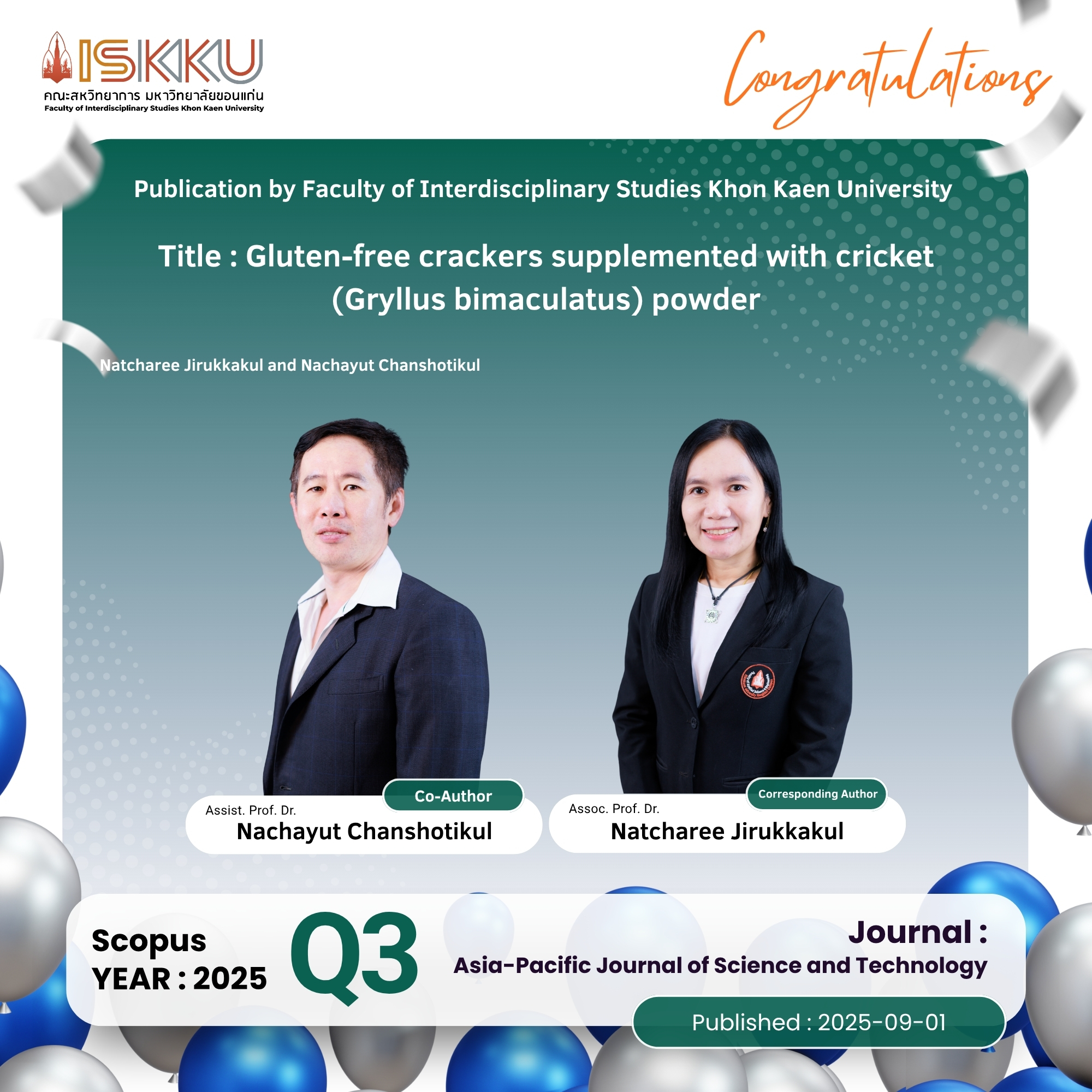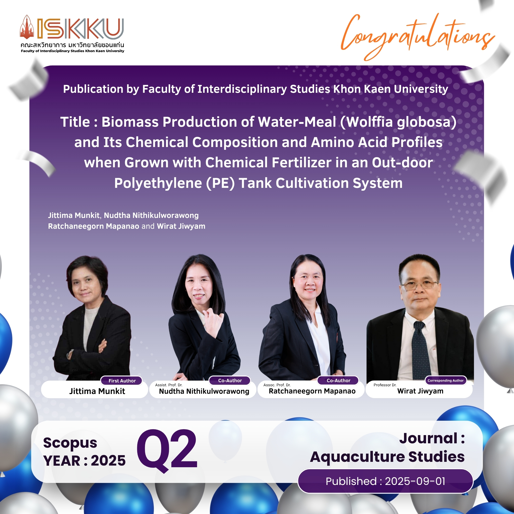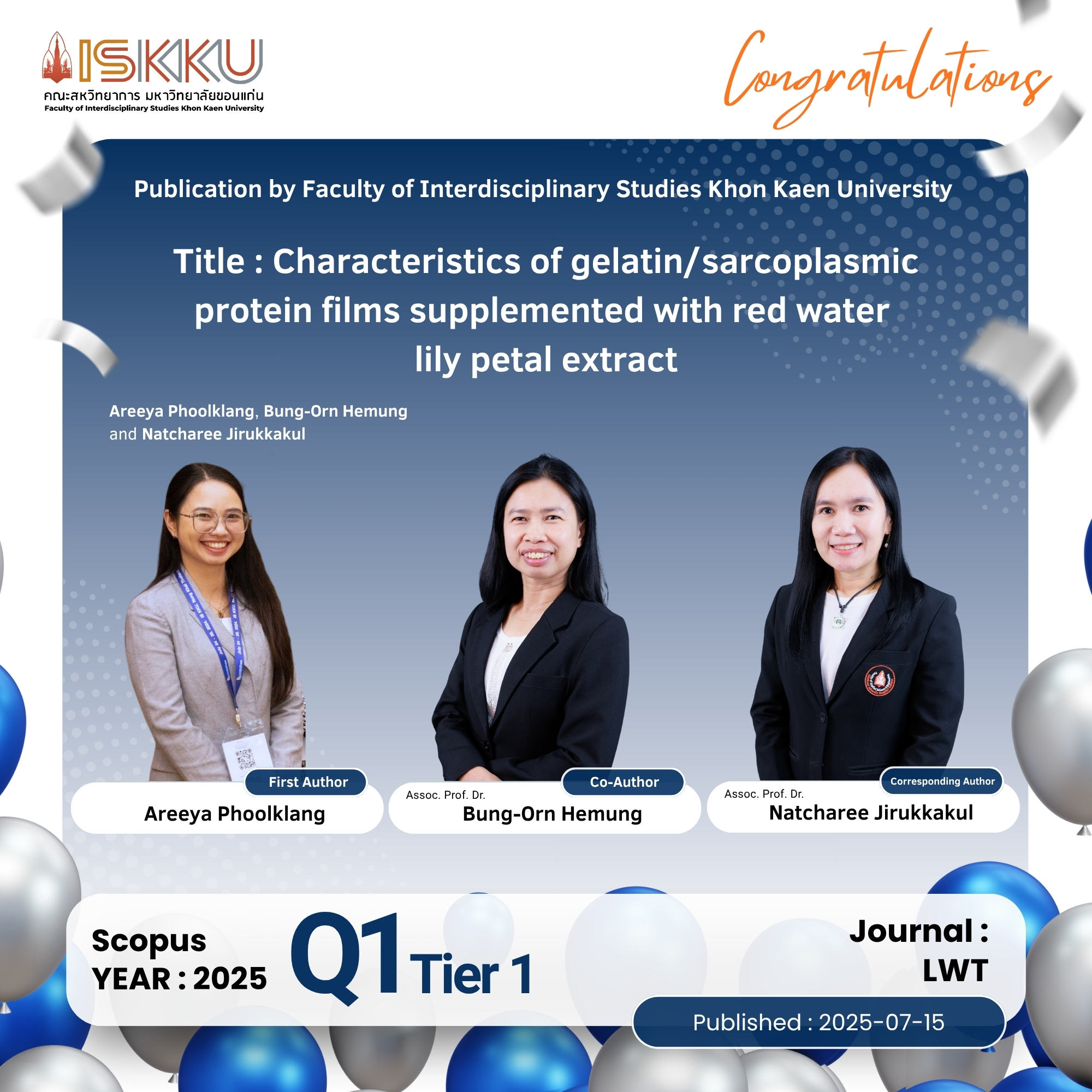 คณะสหวิทยาการ มหาวิทยาลัยขอนแก่น ขอแสดงความยินดีกับคณาจารย์ในโอกาสที่ได้รับการตีพิมพ์วารสารวิชาการระดับนานาชาติ ที่ปรากฎในฐานข้อมูล Scopus Q1 ,Q2 , Q3, Q4 ตั้งแต่วันที่ 1 กรกฎาคม 2568 - 30 กันยายน 2568