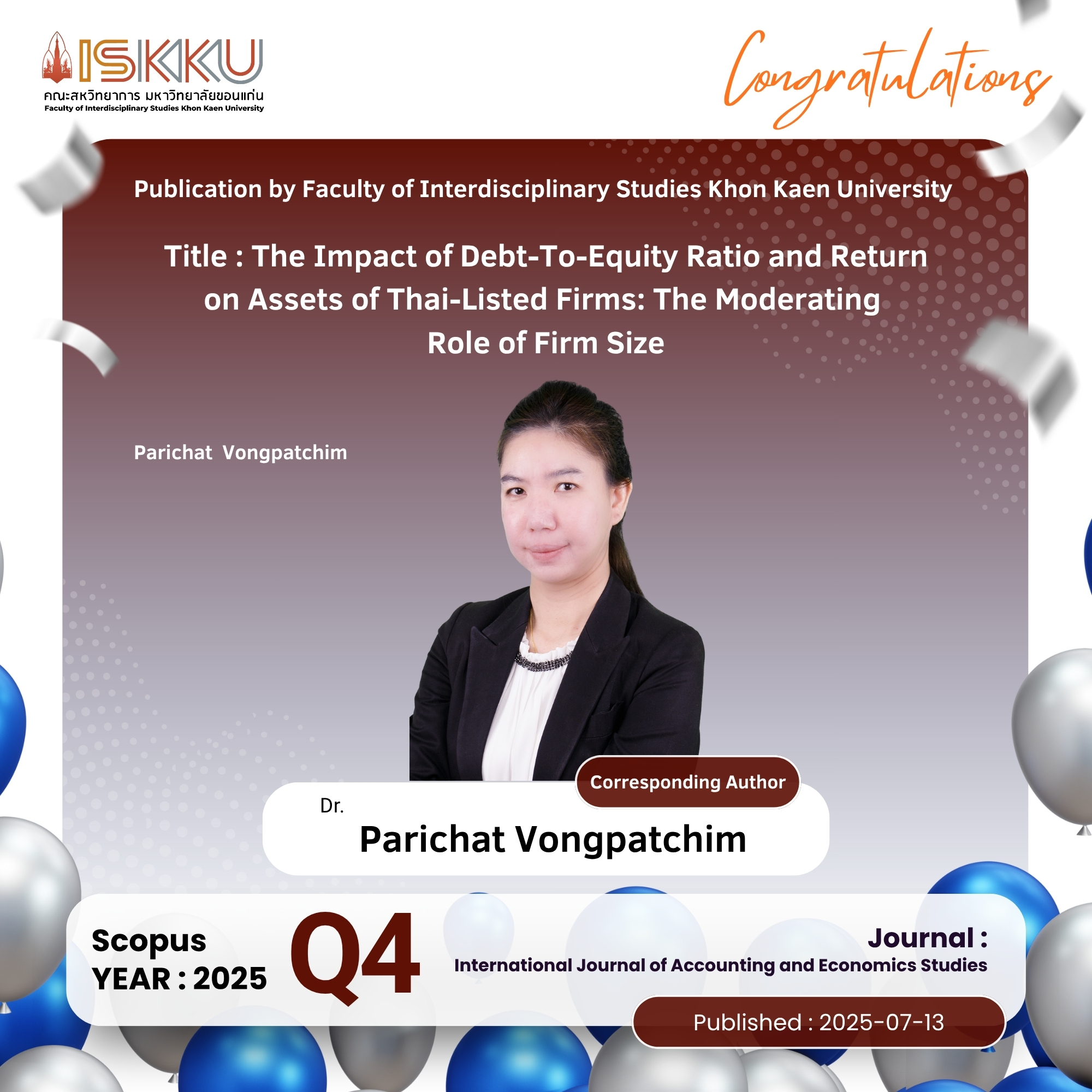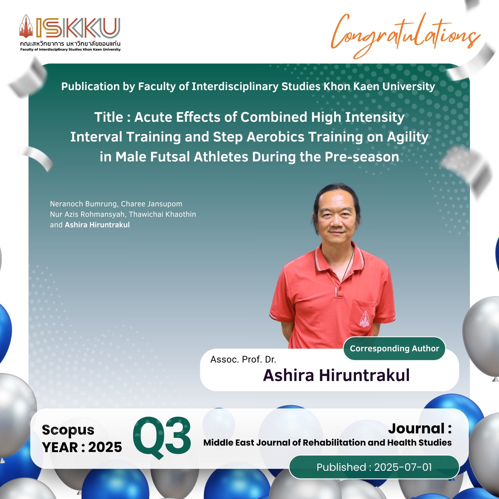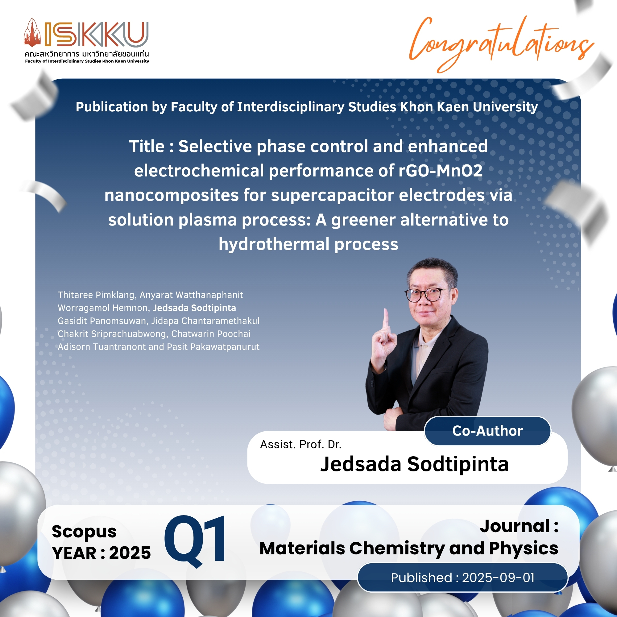 คณะสหวิทยาการ มหาวิทยาลัยขอนแก่น ขอแสดงความยินดีกับคณาจารย์ในโอกาสที่ได้รับการตีพิมพ์วารสารวิชาการระดับนานาชาติ ที่ปรากฎในฐานข้อมูล Scopus Q1 ,Q2 , Q3, Q4 ตั้งแต่วันที่ 1 กรกฎาคม 2568 - 30 กันยายน 2568