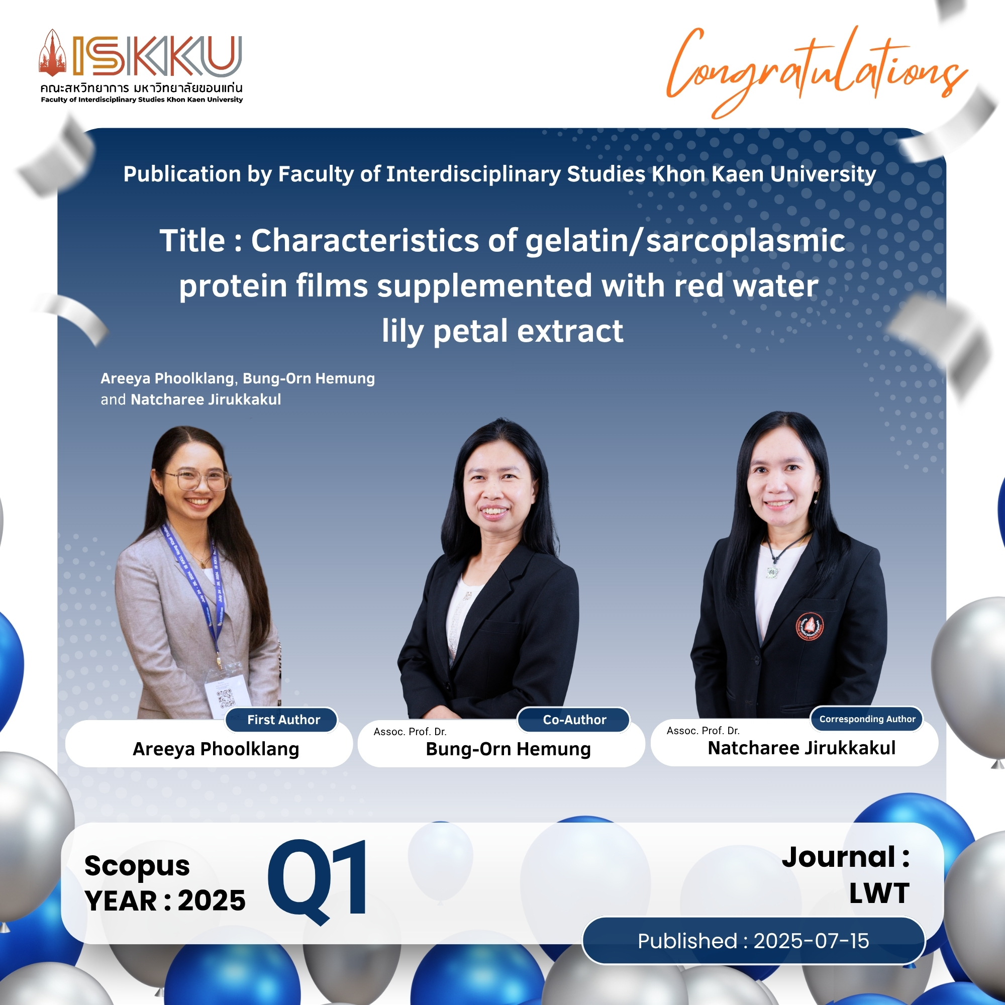 คณะสหวิทยาการ มหาวิทยาลัยขอนแก่น ขอแสดงความยินดีกับคณาจารย์ในโอกาสที่ได้รับการตีพิมพ์วารสารวิชาการระดับนานาชาติ