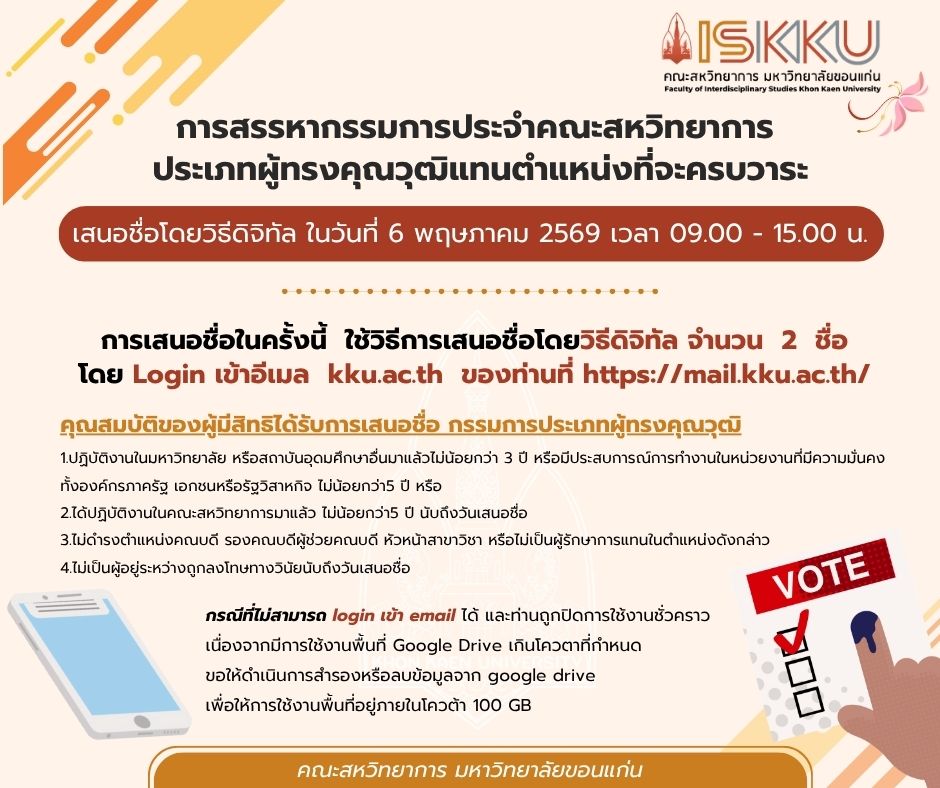 การเสนอชื่อในครั้งนี้ ใช้วิธีการเสนอชื่อโดยวิธีดิจิทัล จำนวน 2 ชื่อ โดย Login เข้าอีเมล kku.ac.th ของท่านที่ https://mail.kku.ac.th/
