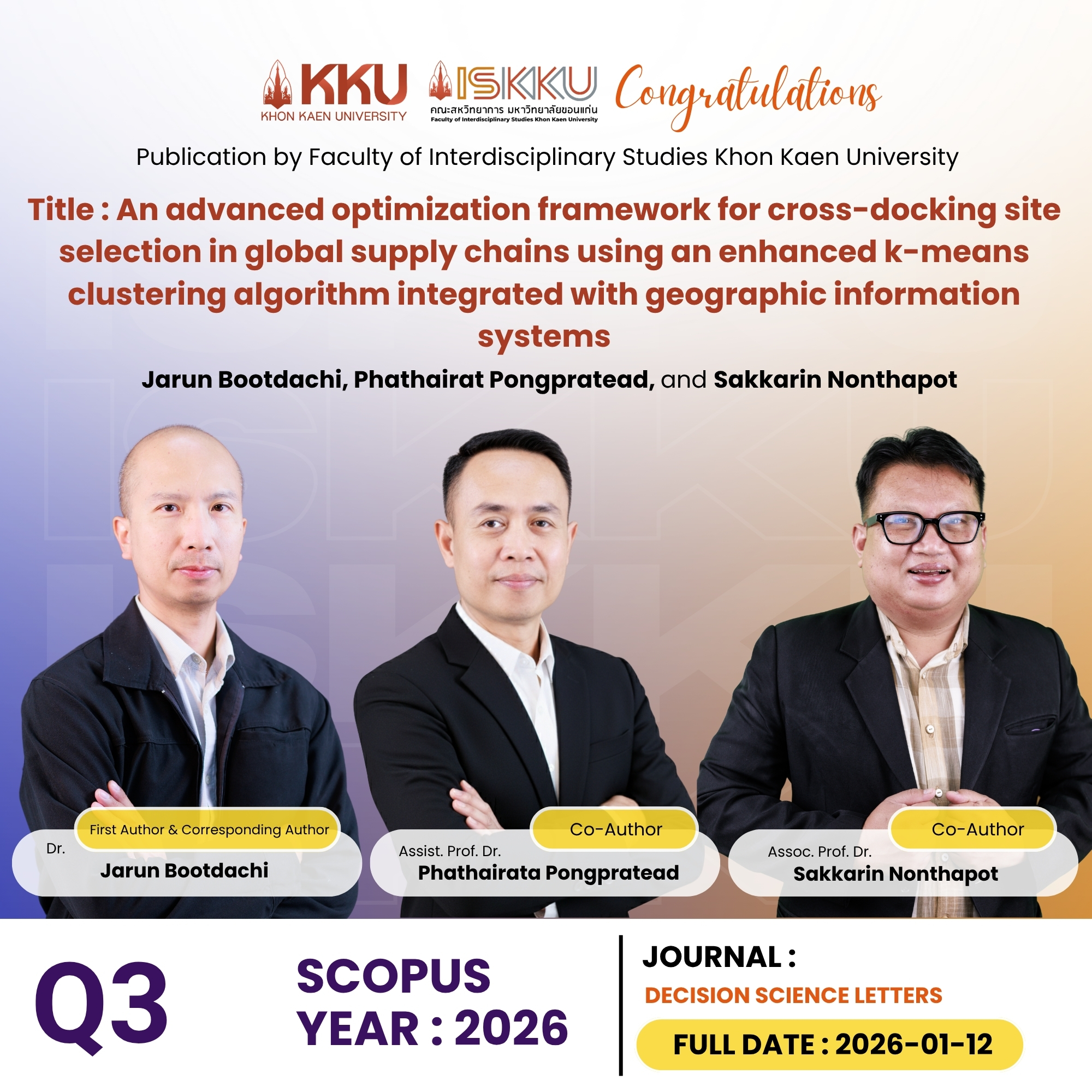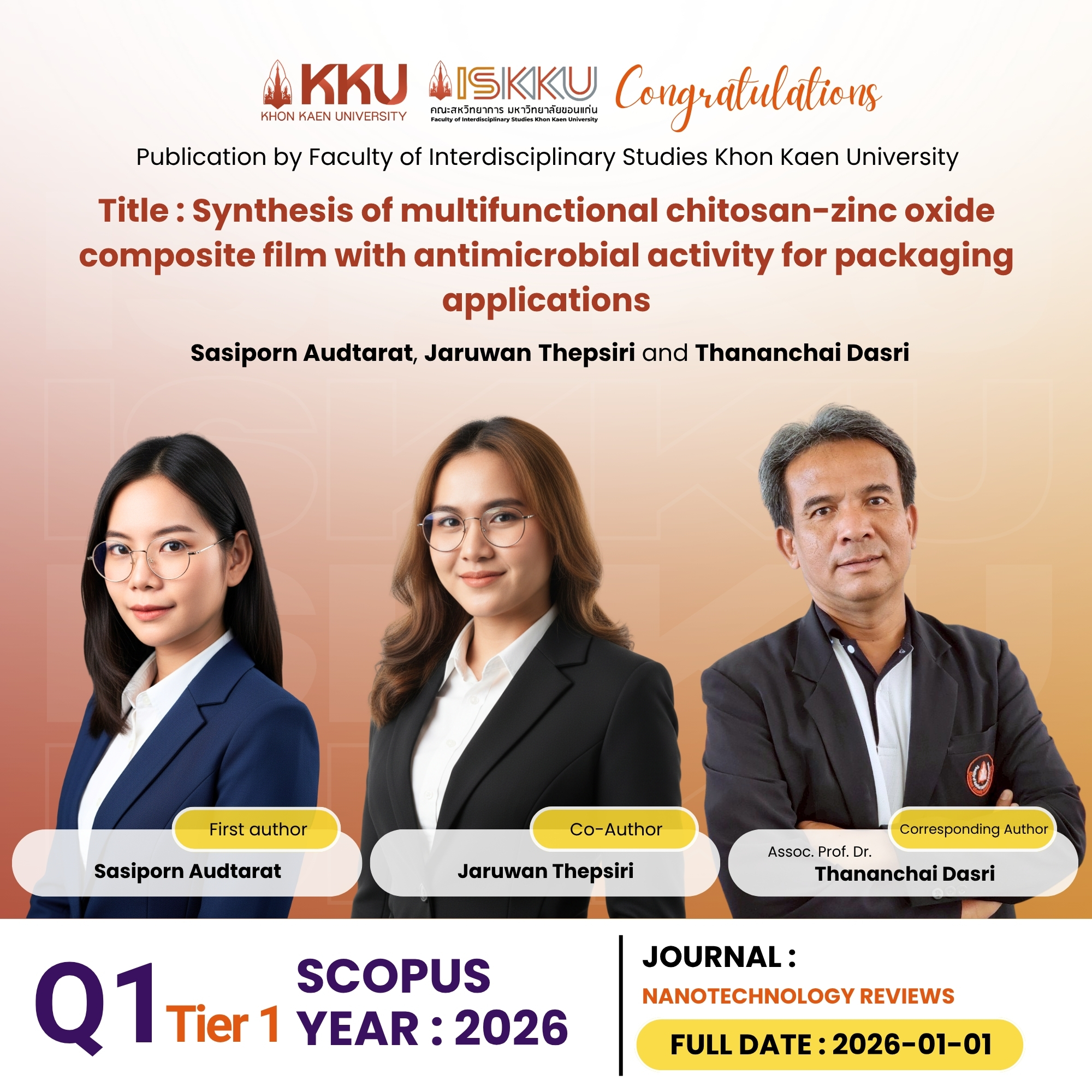 คณะสหวิทยาการ มหาวิทยาลัยขอนแก่น ขอแสดงความยินดีกับคณาจารย์และนักศึกษาระดับบัณฑิตศึกษา ในโอกาสที่ได้รับการตีพิมพ์วารสารวิชาการระดับนานาชาติ ที่ปรากฎในฐานข้อมูล Scopus Q1 , Q2 , Q3 ตั้งแต่วันที่ 1 มกราคม - 31 มีนาคม 2569 โดยอ้างอิงจากวัน Full Date วารสาร