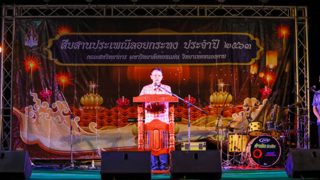 29 ต.ค. 63 คณะสหวิทยาการ มหาวิทยาลัยขอนแก่น วิทยาเขตหนองคาย จัดโครงการสืบสานประเพณีลอยกระทง ประจำปี 2563 เพื่อส่งเสริมให้อาจารย์ บุคลากร นักศึกษา ตลอดจนประชาชนทั่วไป ได้ร่วมสืบสานอนุรักษ์วัฒนธรรมประเพณีอันดีงามของไทย ทั้งนี้มี ผู้บริหาร อาจารย์ นักศึกษา และประชาชนทั่วไปให้ความสนใจเข้าร่วมกิจกรรมสืบสานประเพณีลอยกระทงในปีนี้อย่างคับคั่ง ในพิธีเปิดงานได้รับเกียรติจาก ผศ.ดร.เกียรติ แสงอรุณ คณบดีคณะสหวิทยาการ เป็นประธานเปิดงาน โดยมีนายละมุณ กั้งจำปา ผู้อำนวยการกองบริหารงานคณะสหวิทยาการ กล่าวรายงานวัตถุประสงค์การจัดงาน