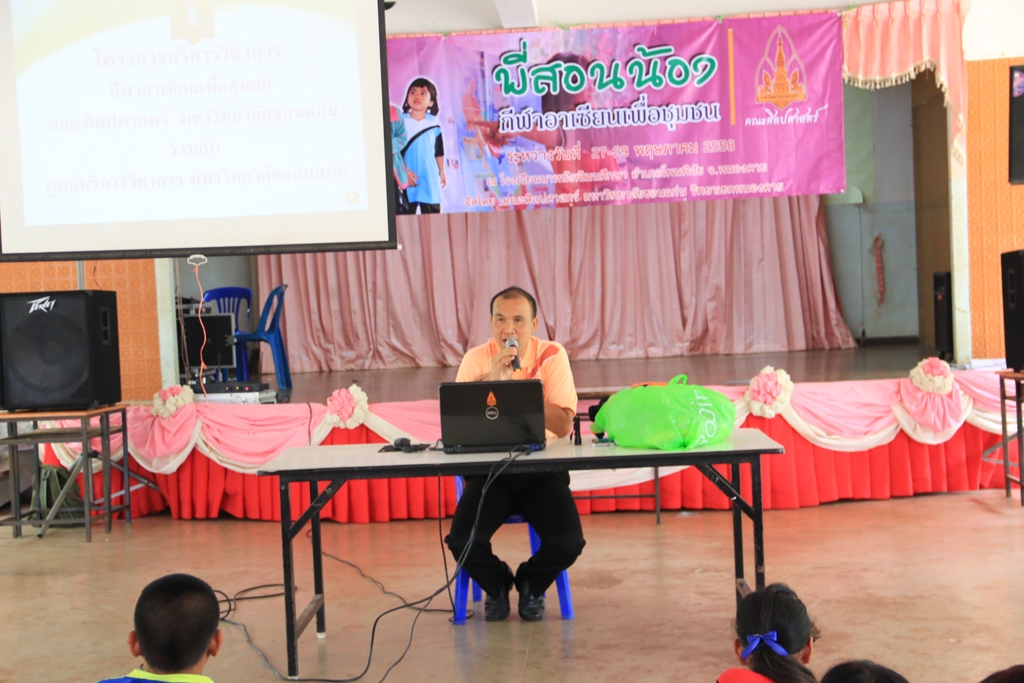 คณะศิลปศาสตร์ เปิดโครงการพี่สอนน้อง กีฬาอาเซียนเพื่อชุมชน เผยแพร่ความรู้กีฬาอาเซียนและสอนมวยไทยโบราณให้กับนักเรียน โรงเรียนนาหนังพัฒนศึกษา อำโพนพิสัย จังหวัดหนองคาย เมื่อวันที่ 27 พฤษภาคม 2558 เวลา 09.00 น. โดยมีนายพงศักดิ์ ธรรมะคูปัก ประธานสถานศึกษาตำบลนาหนัง ได้กล่าวต้อนรับคณาจารย์ เจ้าหน้าที่และนักศึกษาจากมหาวิทยาลัยขอนแก่น วิทยาเขตหนองคาย และผศ.จรูญศักดิ์ พันธวิศิษฏ์ ผู้ช่วยอธิการบดีฝ่ายกีฬา หัวหน้าโครงการได้กล่าวรายงานการจัดโครงการต่อ ผศ.ดร.คมศร ลมไธสง รองผู้อำนวยการศูนย์บริการวิชาการ ซึ่งให้เกียรติมาเป็นประธานในพิธี โดยโครงการได้มีการจัดกิจกรรมระหว่างรุ่นพี่นักศึกษา มหาวิทยาลัยขอนแก่น วิทยาเขตหนองคายจำนวน 60 คนและรุ่นน้อง นักเรียนโรงเรียนนาหนังพัฒนศึกษา จำนวน480 คน มีกิจกรรมกีฬาสานสัมพันธ์พี่น้องและประกวดการแสดงอาเซียน พร้อมทั้งมีกิจกรรมสานสัมพันธ์กับชุมชนทำพิธีบายศรีสู่ขวัญ ต้อนรับเป็นลูกหลาน พ่อฮัก แม่ฮักและมอบอุปกรณ์กีฬาให้กับทางโรงเรียนนาหนังพัฒนศึกษา ซึ่งโครงการฯดังกล่าว ได้จัดขึ้นระหว่างวันที่ 27 – 29 พฤษภาคม 2558