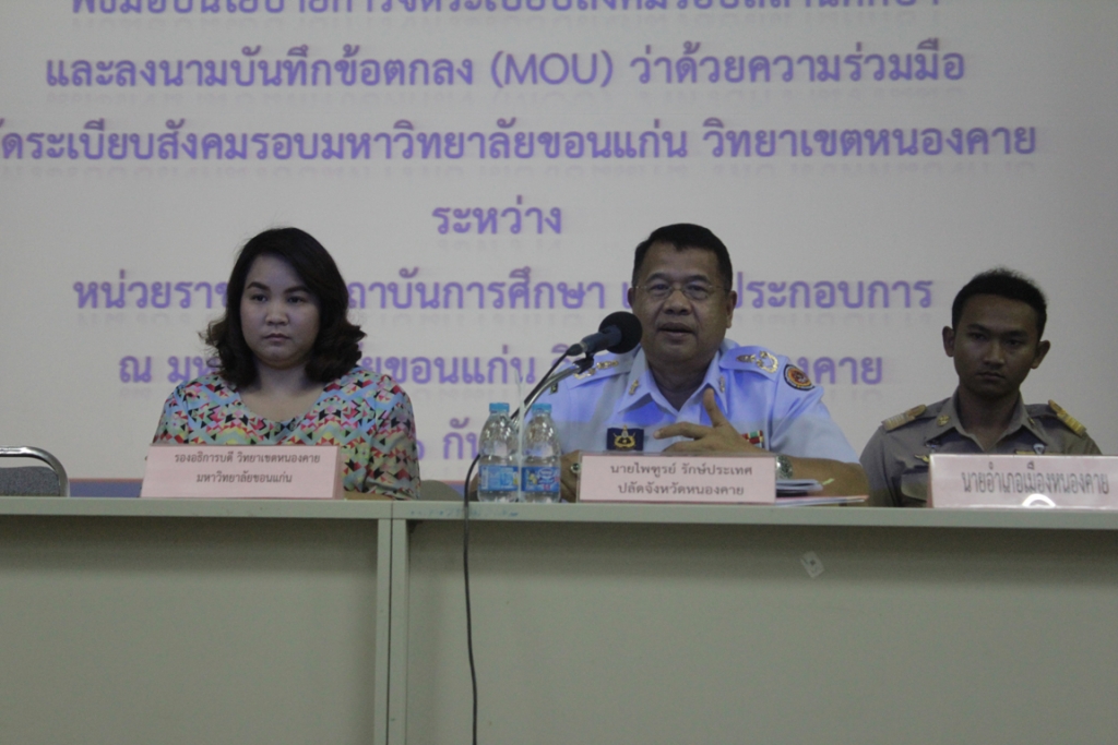 เมื่อวันที่ 21 กันยายน 2558 เวลา 13.30 น. ณ ห้องประชุม NK 1407 อาคารสำนักงานบริหาร วิทยาเขตหนองคาย วิทยาเขตหนองคายร่วมกับหน่วยงานราชการ ผู้ประกอบการรอบวิทยาเขตหนองคาย จัดประชุมชี้แจงการดำเนินโครงการจัดระเบียบสังคมรอบสถานศึกษา (Campus Safety Zone) และพิธีลงนามบันทึกข้อตกลง Memorandum of Understanding (MOU) ว่าด้วยความร่วมมือจัดระเบียบสังคมรอบรอบ วิทยาเขตหนองคาย มหาวิทยาลัยขอนแก่น โดยมีนายสุชาติ นพวรรณ ผู้ว่าราชการจังหวัดหนองคาย ผศ.ดร.เกียรติ แสงอรุณ รองอธิการบดีวิทยาเขตหนองคาย อาจารย์ชาติภร เมืองโคตร มุงคุณแสน ผู้ช่วยอธิการบดีวิทยาเขตหนองคาย นายไพฑูรย์ รักษ์ประเทศ ปลัดจังหวัดหนองคาย วัฒนธรรมจังหวัดหนองคาย พัฒนาสังคมและความมั่นคงของมนุษย์จังหวัดหนองคายผู้บังคับการตำรวจภูธรจังหวัดหนองคาย สาธารณสุขจังหวัดหนองคาย สรรพสามิตพื้นที่หนองคาย นายอำเภอเมืองหนองคาย และมีผู้ประกอบการหอพัก สถานบันเทิง ร้านเกมส์ ร้านอินเทอร์เน็ต ฯลฯ เข้าร่วมรับฟังและลงนามความร่วมมือในครั้งนี้