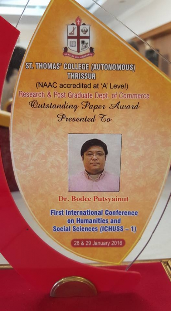 ผศ.ดร.บดี ปุษยายนันท์ ได้รับรางวัล Outstanding Paper Awardประเภท Oral Presentation ในการเข้าร่วมนำเสนอบทความวิชาการในงาน First International Conference on Humanities and Social Sciences (ICHUSS-1) ที่จัดขึ้นโดย Research Department of Commerce, St. Thomas’ College (Autonomous), Thrissur, Kerala, India ระหว่างวันที่ 28-29 มกราคม 2559 โดยได้นำเสนอบทความในหัวข้อ Change in the pattern of community economy under the process of Capitalism: Case study Hin Tang Village Moo7, Non Kong Sub-district, Ban Fang District, KhonKaen Province. และได้รับเชิญให้ร่วมเป็น Chairman ในการประชุมครั้งนี้