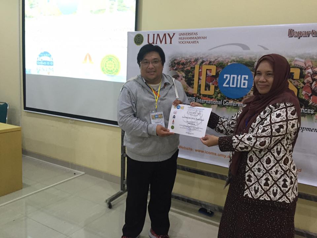 for Community Development : ICOMS 2016เมื่อวันที่ 10 มีนาคม 2559 ณ University of Muhammadiyah เมือง Jogyakarta ประเทศสาธารณรัฐอินโดนีเซีย โดยนำเสนอผลงานทางวิชาการเรื่อง