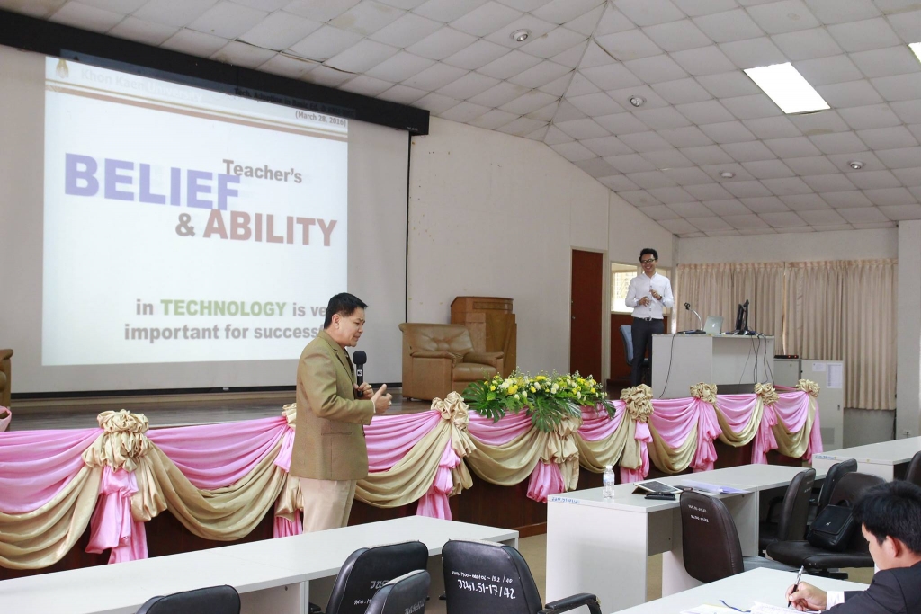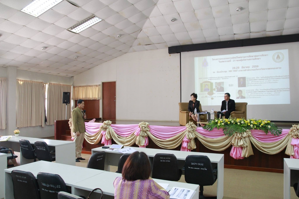 คณะศิลปศาสตร์ มหาวิทยาลัยขอนแก่น วิทยาเขตหนองคาย ได้จัดโครงการกระบวนทัศน์ใหม่ทางการศึกษาในศตวรรษที่ 21 ของผู้บริหารสถานศึกษา ในระกว่างวันที่ 28-29 มีนาคม 2559 ณ มหาวิทยาลัยขอนแก่น วิทยาเขตหนองคาย อาคารสำนักงานบริหาร ชั้น 4 ห้องประชุม NK1407 โดยจัดอบรมให้กับผู้บริหารสถานศึกษาและบุคคลากรทางการศึกษา ในเขตพื้นที่จังหวัดหนองคาย ทั้งหมด 30 คน เพื่อให้ผู้บริหารสถานศึกษาและครูได้รับรู้บทบาทหน้าที่ในการจัดการศึกษาและพัฒนาองค์ความรู้ของผู้บริหารสถานศึกษาและครูในศตวรรษที่ 21 โดยมี รองศาสตราจารย์ ดร.รักชนก แสงภักดีจิต คณบดีคณะศิลปศาสตร์ กล่าวเปิดโครงการอบรม พร้อมทั้งแนะแนวหลักสูตรการศึกษาคณะศิลปศาสตร์ โดย ดร.ปาริชาต ทุมนันท์ ประธานหลักสูตร ซึ่งในภาคเช้าได้รับเกียรติจาก รองศาสตราจารย์ ดร.วัลภา อารีรัตน์ ดร.ประยุทธ ชูสอน คณะศึกษาศาสตร์ มหาวิทยาลัยขอนแก่น ในการเสวนา เรื่อง “กระบวนทัศน์ใหม่ทางการศึกษาต่อการศึกษาในศตวรรษที่ 21 ของผู้บริหารสถานศึกษา” และในภาคบ่ายได้เข้าสู่การบรรยายในหัวข้อ “เครื่องมือส่งเสริมการเรียนรู้แบบร่วมมือกันสำหรับการศึกษาในศตวรรษที่ 21” และ “การเรียนรู้แบบไร้ขอบเขตโดยอ้างอิงบริบทโดยใช้อุปกรณ์แบบพกพา” โดยผู้ช่วยศาสตราจารย์ ดร.อิศรา ก้านจักร ผู้อำนวยการสำนักนวัตกรรมการเรียนการสอน มหาวิทยาลัยขอนแก่น และ ผู้ช่วยศาสตราจารย์ ดร.นิวัฒน์ ศรีสวัสดิ์ รองผู้อำนวยการสำนักนวัตกรรมการเรียนการสอน มหาวิทยาลัยขอนแก่น ซึ่งผู้เข้าอบรมได้รับความรู้ในการใช้เครื่องมือในการจัดการเรียนรู้ในศตวรรษที่ 21 พร้อมทั้งได้ทดลองจัดการเรียนรู้โดยใช้สื่อสังคมออนไลน์เข้ามาช่วยในการจัดการเรียนรู้