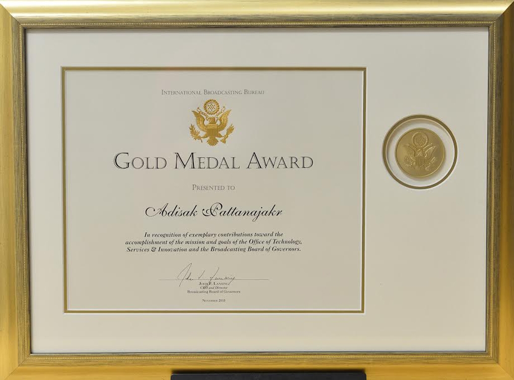 ทั้งนี้รางวัล Gold Medal Award เป็นรางวัลที่นายอดิศักดิ์ ได้ทำวิทยานิพนธ์ เรื่อง Automation broadcast radio by using audio mute clock เข้าร่วมประกวด The office of Technology, Service &Innovation and the Broadcasting Board of Governors โดยมีผู้ส่งผลงานเข้าร่วมประกวดจากทั่วโลก กว่า 100 โครงการ นายอดิศักดิ์ พัฒนจักร เป็นนักศึกษาระดับปริญญาโท หลักสูตรวิศวกรรมศาสตรมหาบัณฑิต สาขาวิศวกรรมโทรคมนาคม อิเล็กทรอนิกส์และคอมพิวเตอร์ คณะวิทยาศาสตร์ประยุกต์และวิศวกรรมศาสตร์ โดยมี ผศ.ดร.อนันต์ เครือทรัพย์ถาวร อาจารย์ประจำคณะวิศวกรรมศาสตร์ เป็นอาจารย์ที่ปรึกษาหลัก และ ศ.ดร.อภิรัฐ ศิริธราธิวัตร คณบดีคณะวิศวกรรมศาสตร์ เป็นอาจารย์ที่ปรึกษาร่วม ทั้งนี้ โครงการฯดังกล่าวได้ถูกนำไปติดตั้งและใช้ออกอากาศจริงที่สถานีออกอากาศวิทยุ FM ที่ประเทศมองโกเลีย