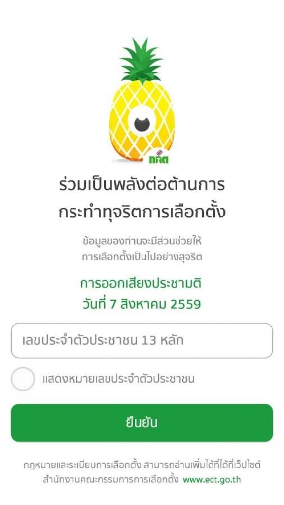 สำนักงานคณะกรรมการการจัดทำแอพพลิเคชั่น “ตาสับปะรด” บนโทรศัพท์เคลื่อนที่ แบบสมาร์ทโฟน และแท็บเล็ต เพื่อใช้รายงานสถานการณ์การออกเสียงประชามติ แจ้งข่าวการทุจริตการออกเสียงประชามติ ทั้งนี้ แอพพลิเคชั่น "ตาสับปะรด" มีขึ้น เพื่อเป็นอีกหนึ่งช่องทางที่ช่วยอำนวยความสะดวกต่อประชาชน ในการแจ้งเบาะแสของการทุจริตการเลือกตั้ง ด้วยความสะดวกรวดเร็วและทันสมัย ซึ่งผู้ใช้งานสามารถรายงานสถานการณ์ได้ทั้ง ข้อความ ภาพ เสียง หรือวีดีโอ ผ่านทางแอปพลิเคชั่น ข้อมูลจะถูกส่งเข้ามาดูแล และจัดเก็บรักษาอย่างปลอดภัย โดยผู้ใช้งานสามารถติดตั้งได้ทั้ง ระบบ iOS และ android